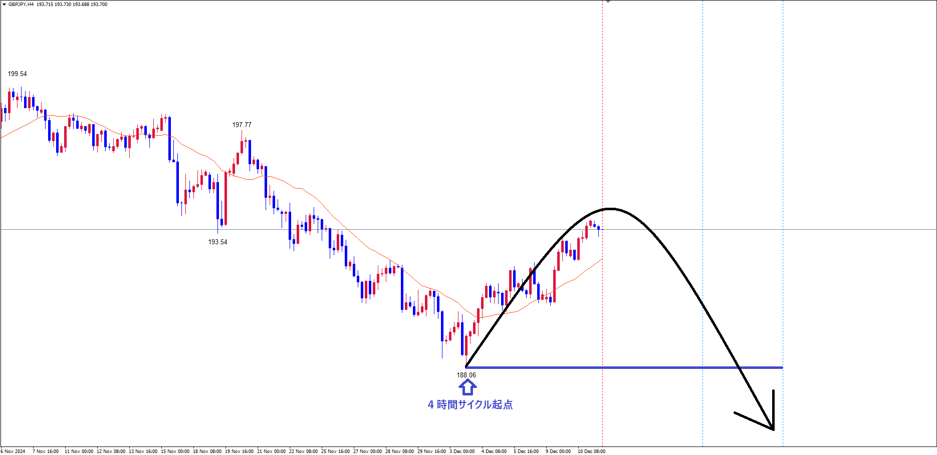 4時間サイクルは、起点青のライン(12/3の安値188.06)から、現在35本目です✅