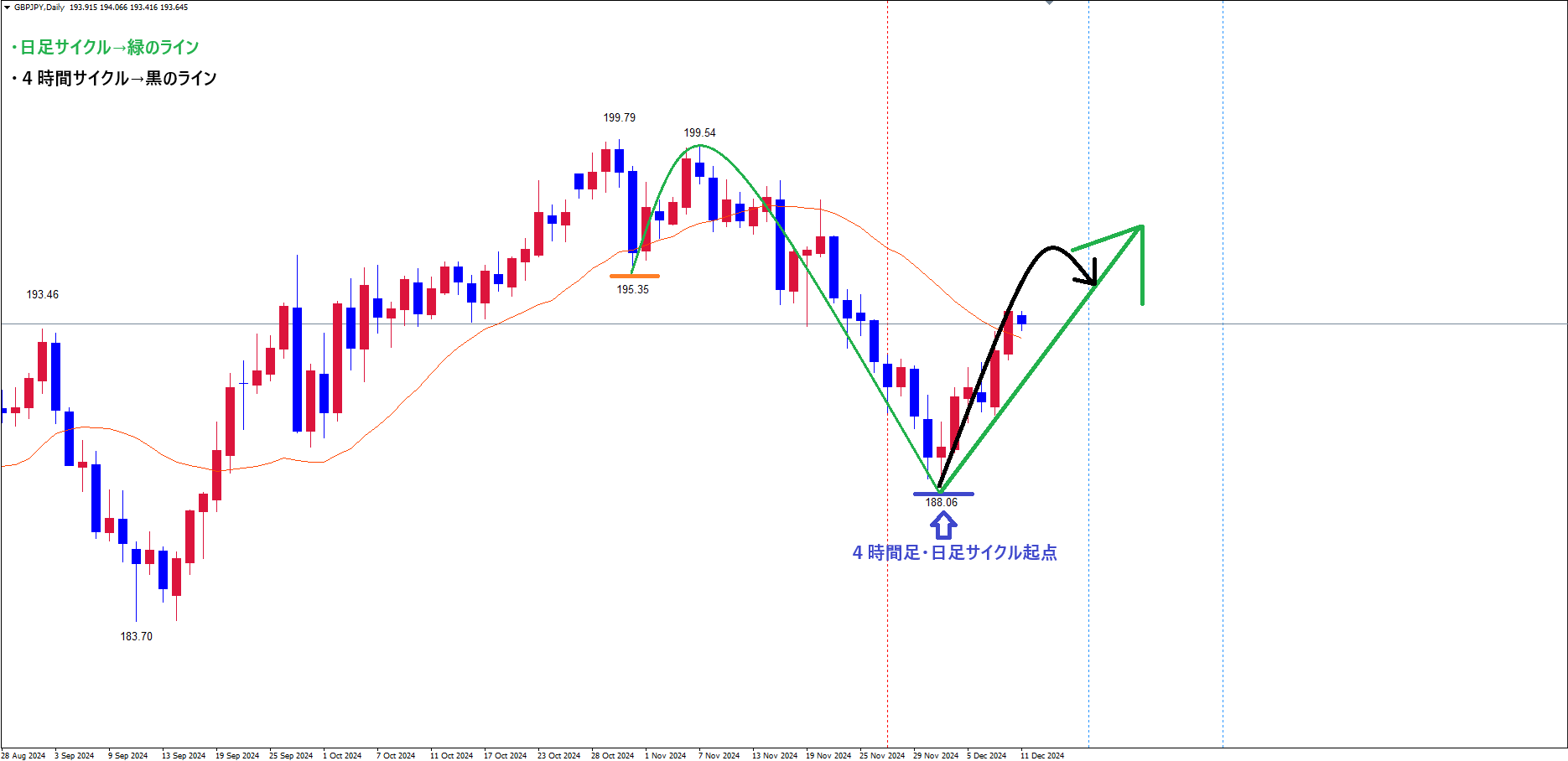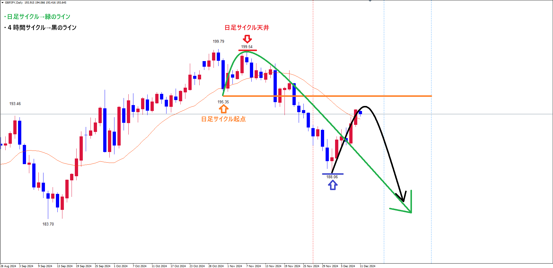この場合、日足サイクルは、起点青のライン(12/3の安値188.06)から、現在7本目という事になります✅