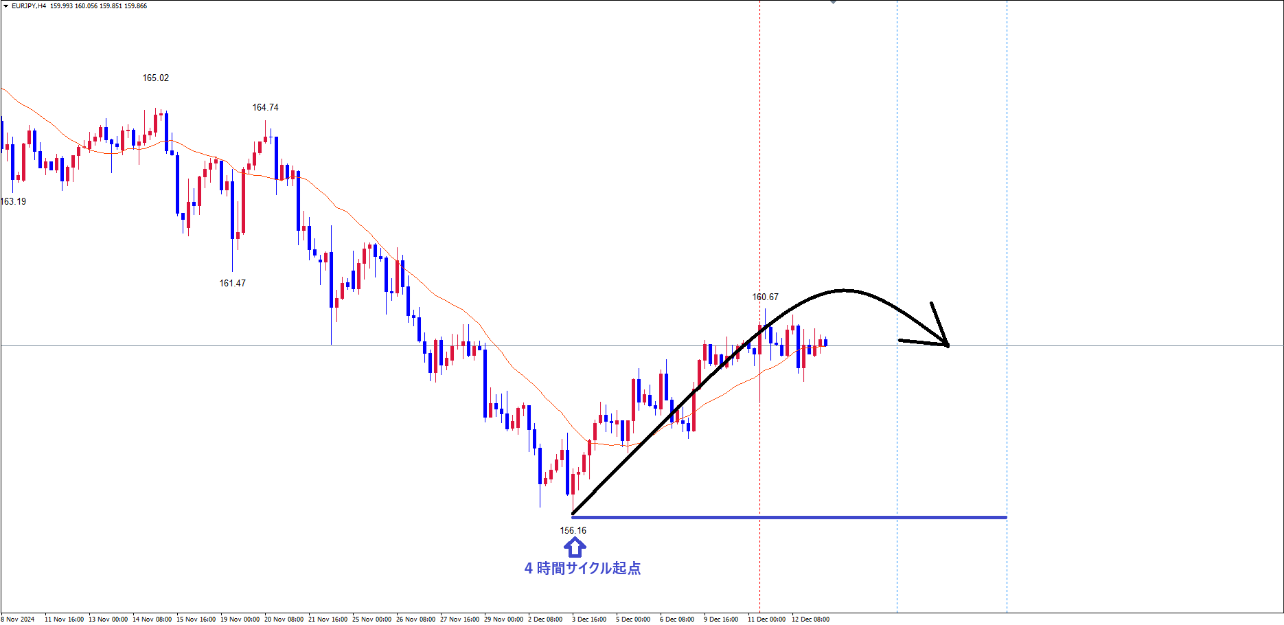 4時間サイクルは、起点青のライン(12/3の安値156.16)から、現在47本目です✅