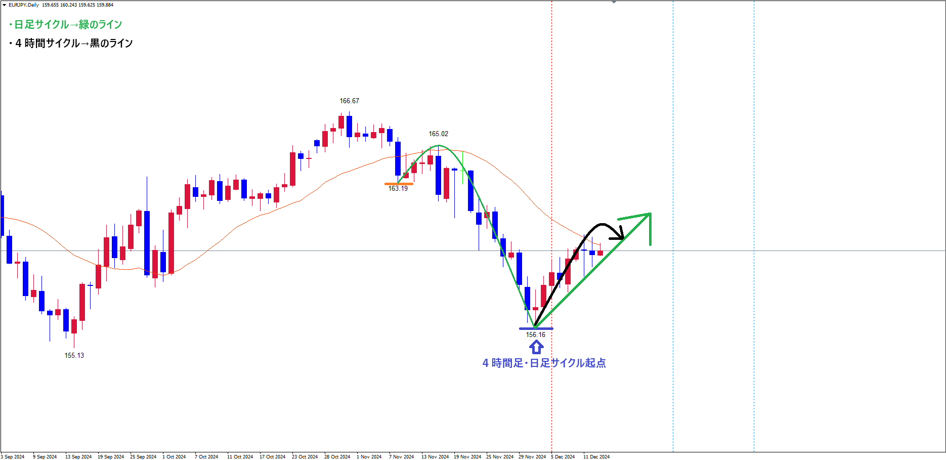 なので、日足サイクルは、起点青のライン(12/3の安値156.16)から、現在9本目という形を基本に見ていきます✅