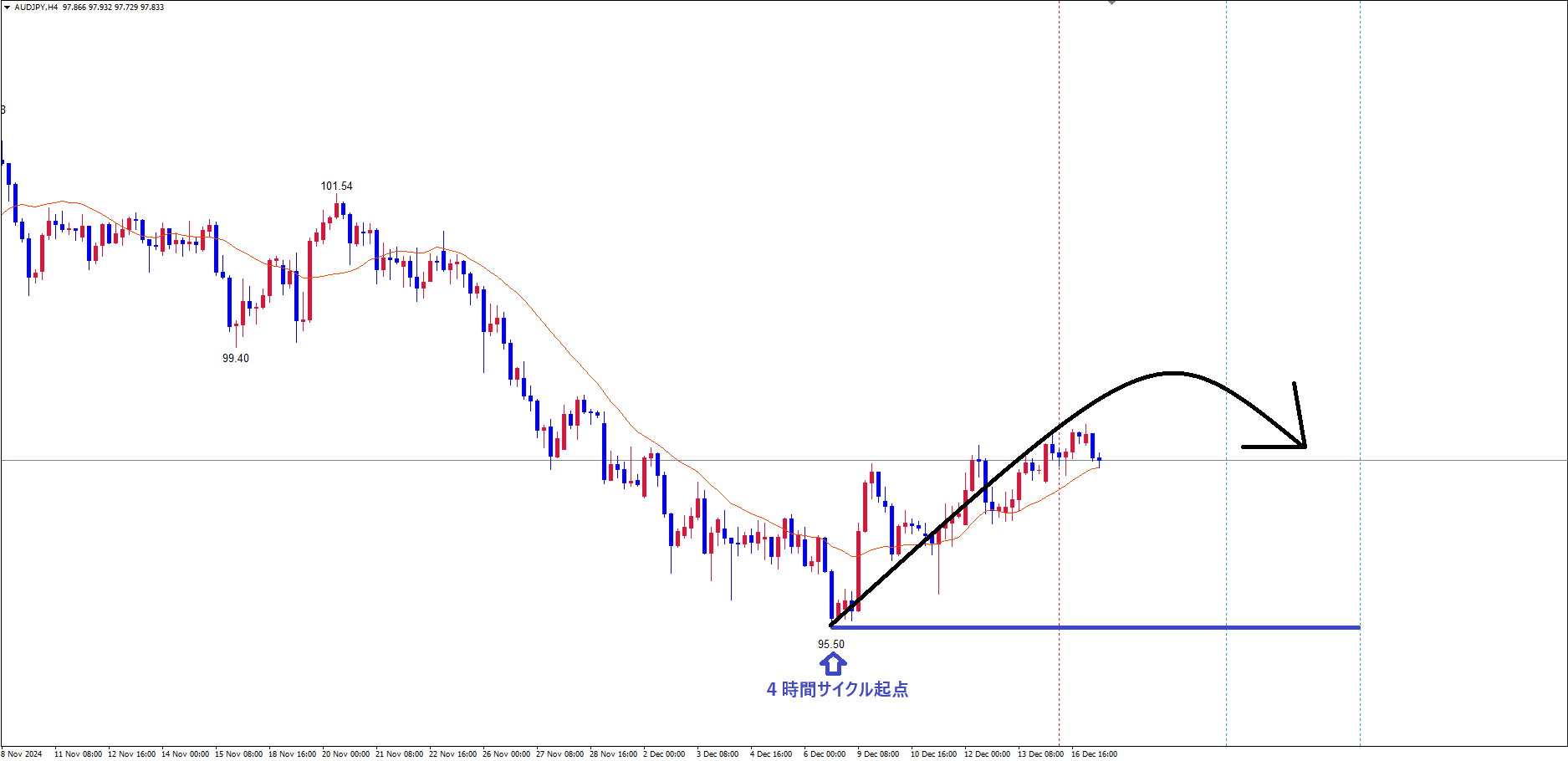 4時間サイクルは、起点青のライン(12/6の安値95.50)から、現在41本目です✅