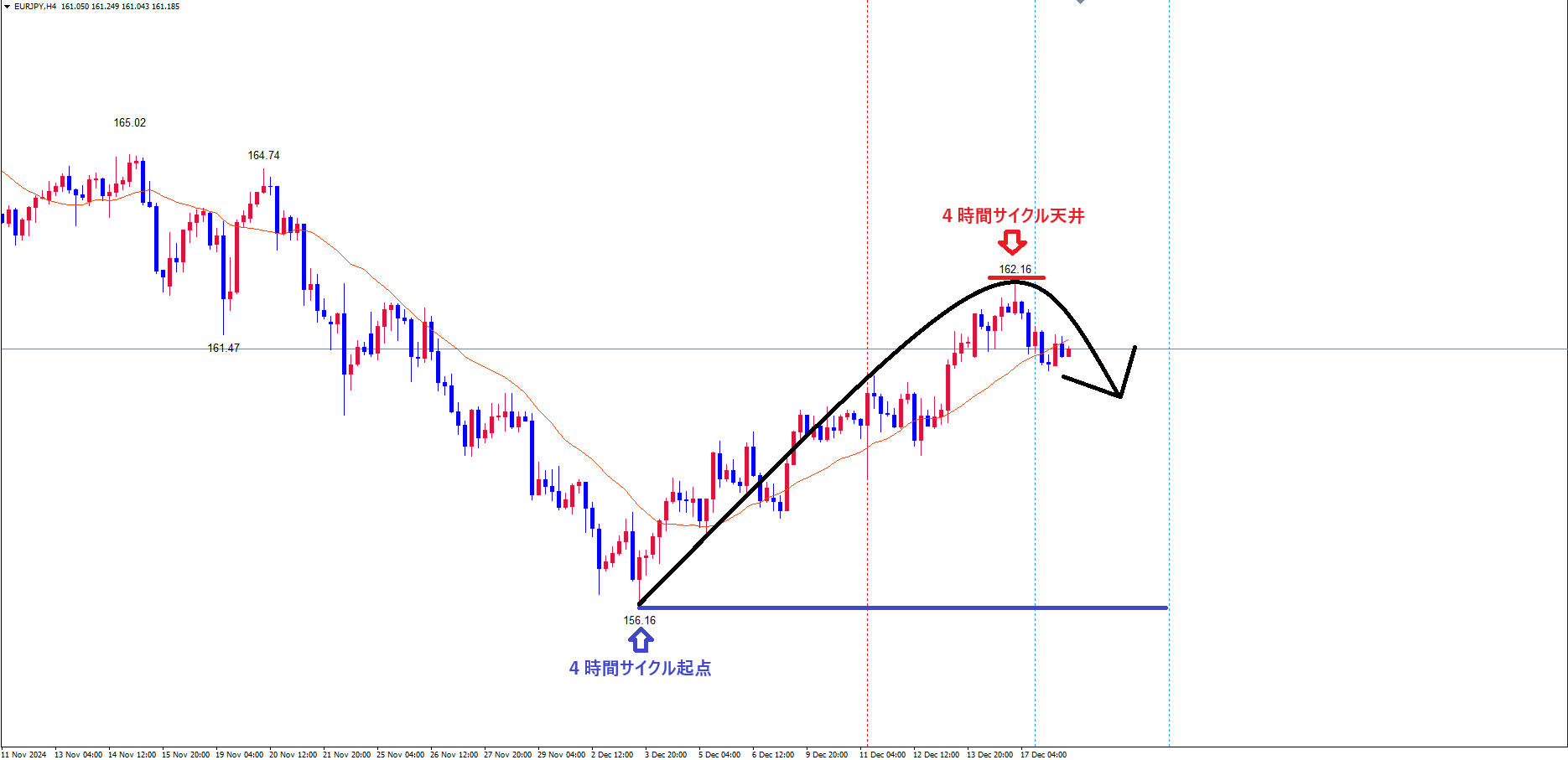4時間サイクルは、起点青のライン(12/3の安値156.16)から、現在65本目です✅