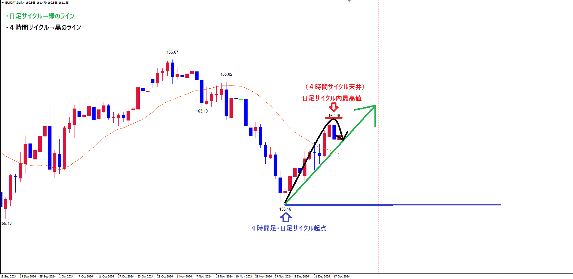 現在は、直近のサイクル内最高値赤のライン(12/17の高値162.16)でサイクル天井を付け、底へ向けて下落の波、方向感:下方向 という認識です✅