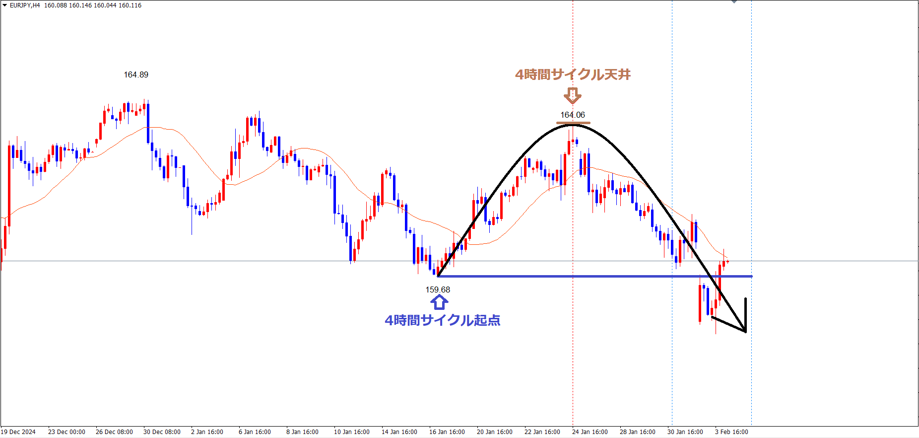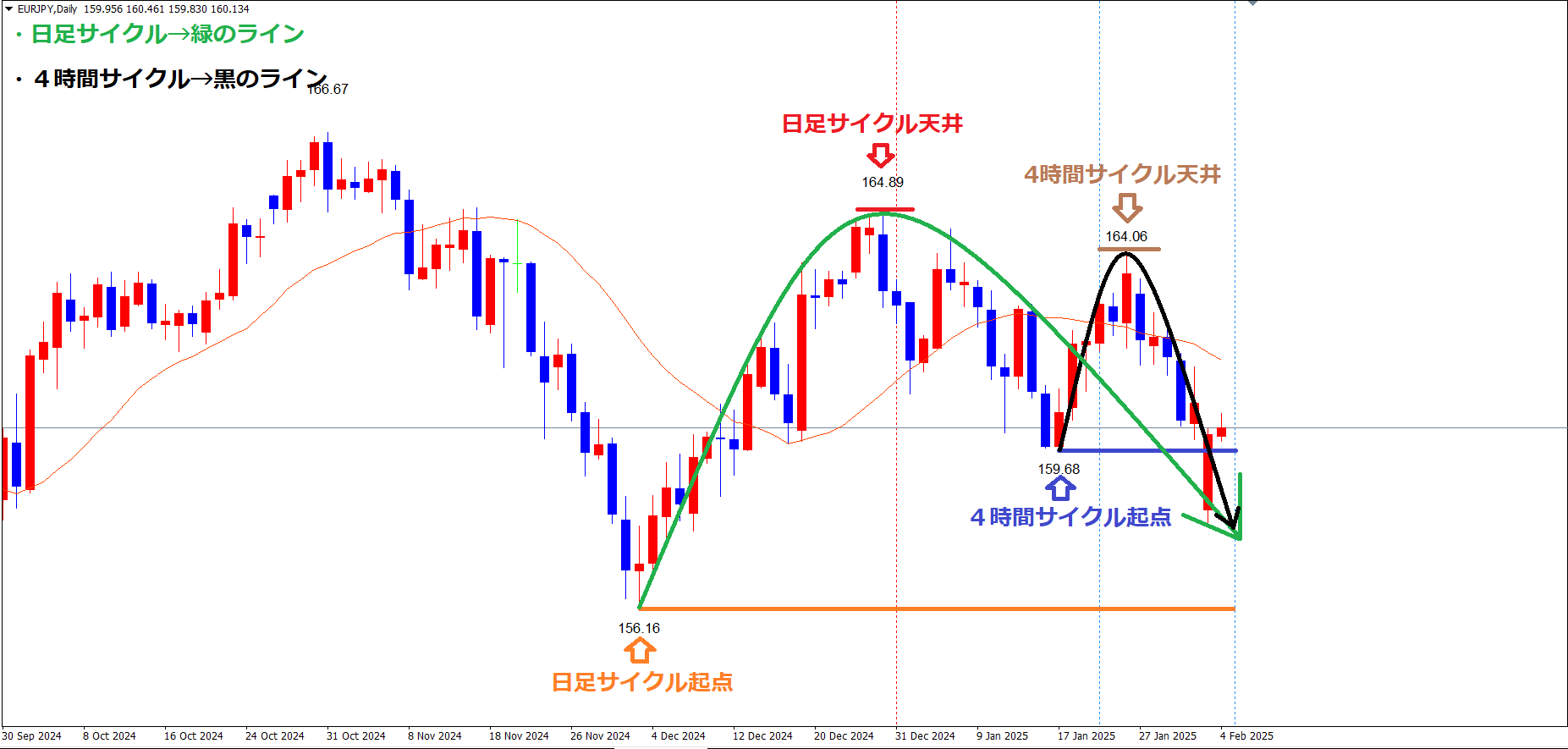 日足サイクルも、現在は、赤のライン(12/30の高値164.89)で天井を付け、サイクル底へ向けて下落の波、方向感:下方向 という認識で、