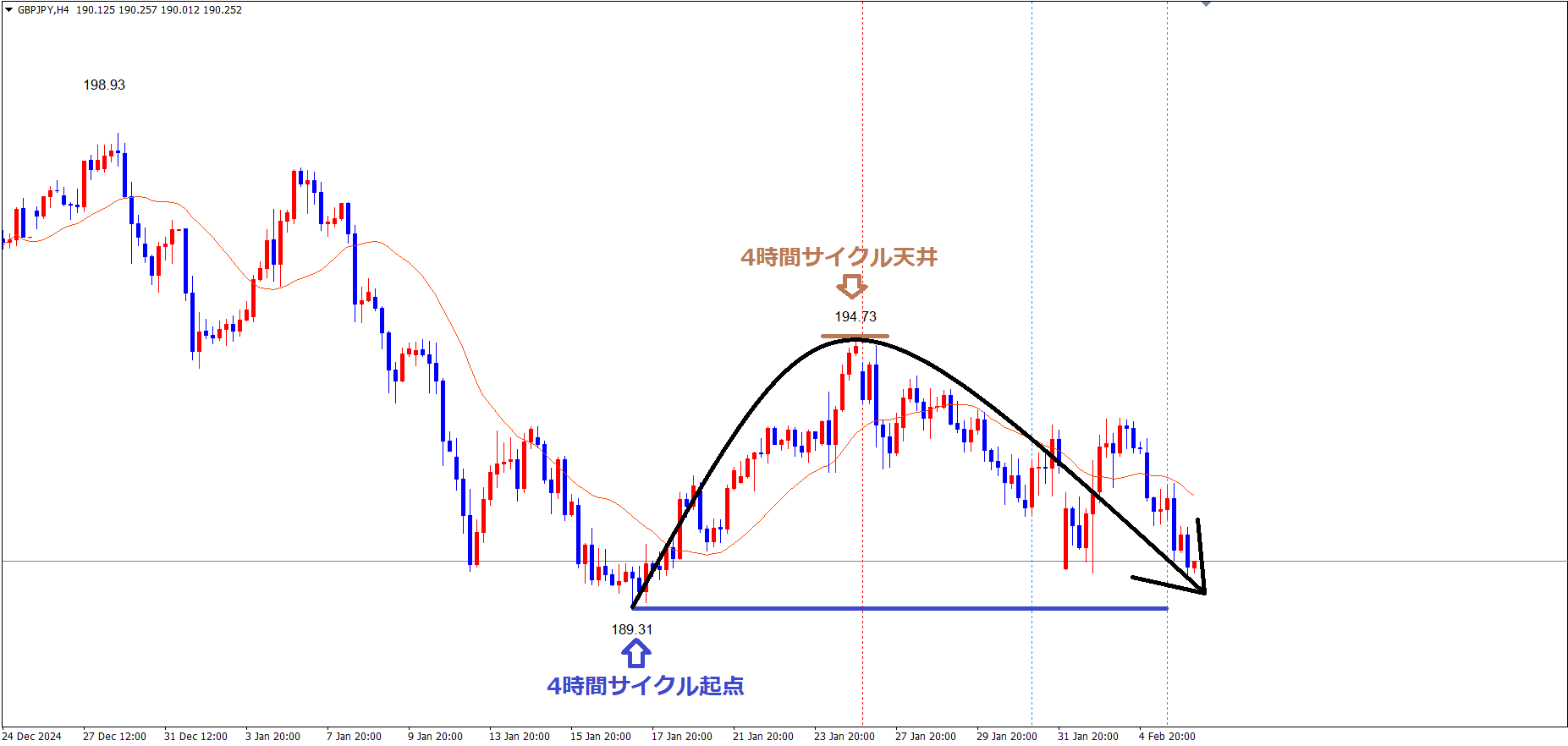 直近の日足サイクル内最安値(4時間サイクル起点)青のライン(1/17の安値189.31)を、32本目に付けていて、底を付けるには少し早いので、