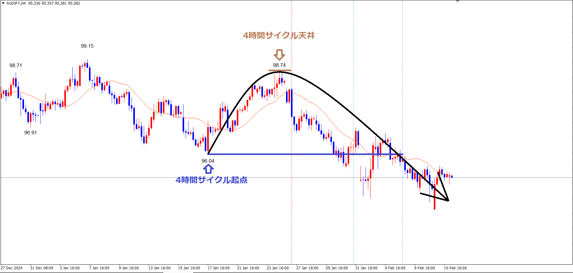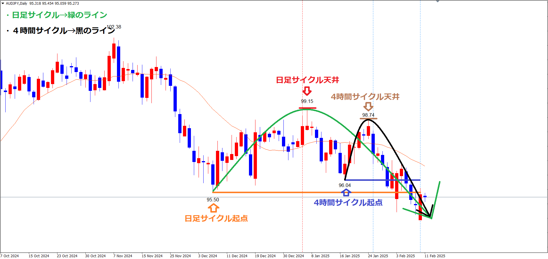 現在は、赤のライン(1/7の高値99.15)で天井を付け、サイクル底へ向けて下落の波、方向感:下方向 という認識ですが、