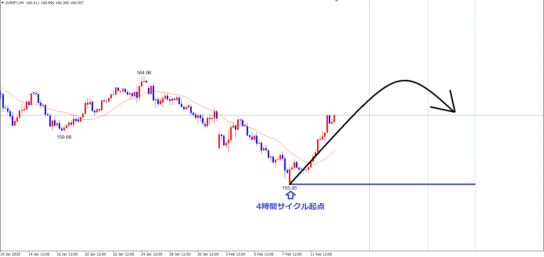 4時間サイクル起点青のライン(2/10の安値155.45)付近で、ロングを狙う場面です✅