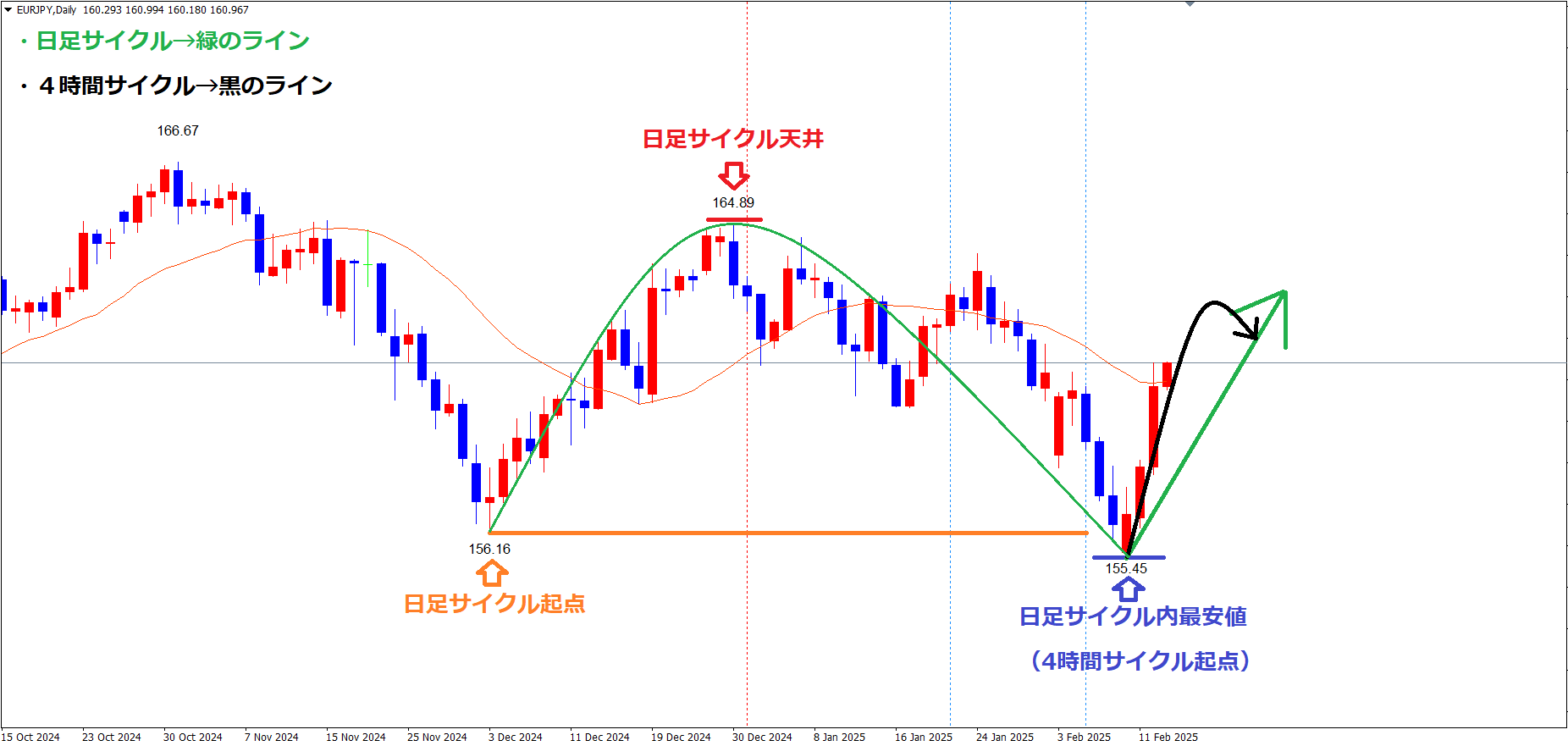 なので、日足サイクルも、直近のサイクル内最安値青のライン(2/10の安値155.45)で底を付けていると見て、