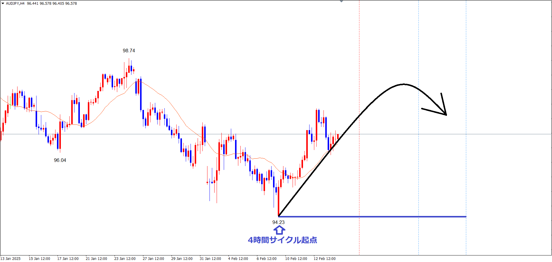 これまで、赤のライン(1/7の高値99.15)で天井を付け、サイクル底へ向けて下落してきた流れで、