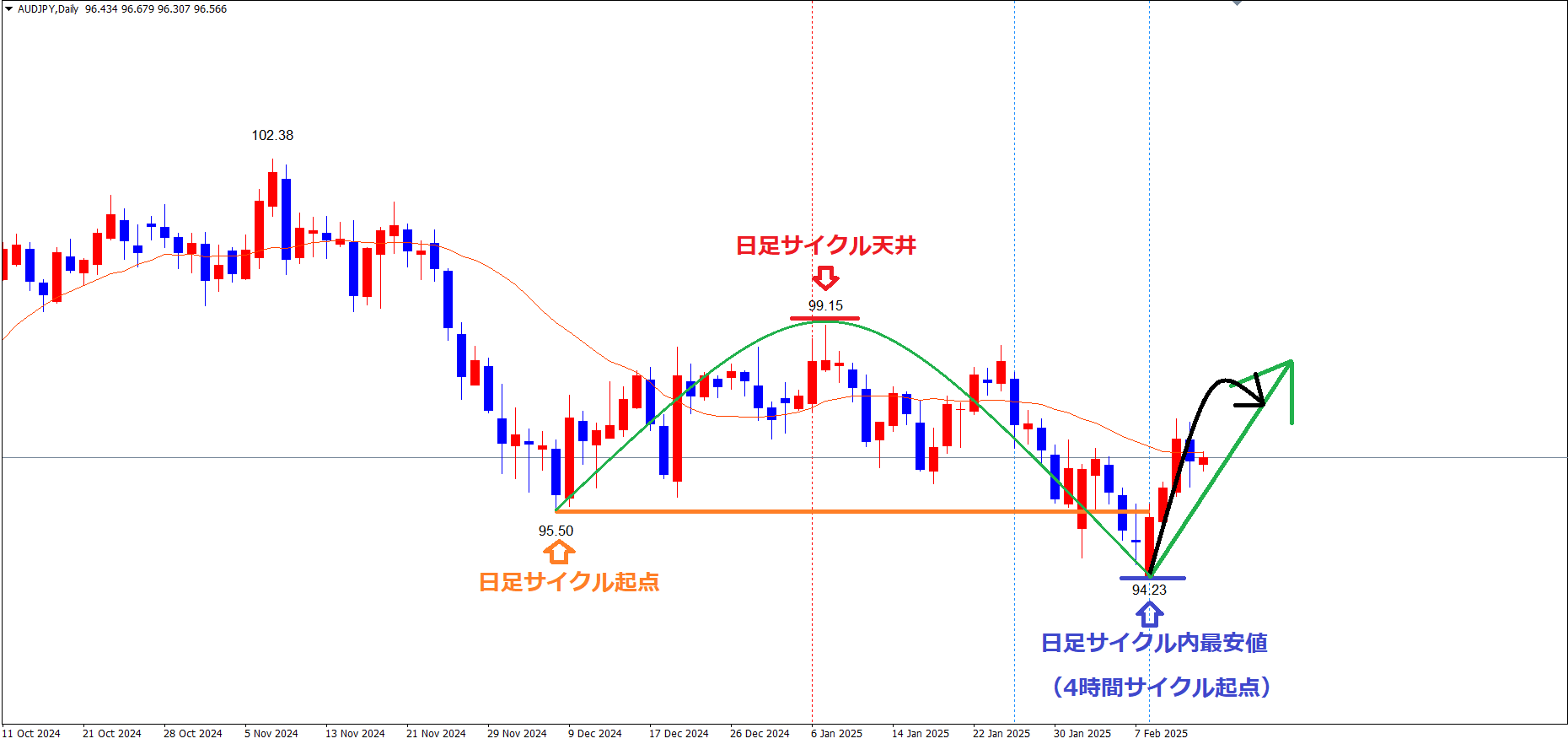 なので、日足サイクルも、直近のサイクル内最安値青のライン(2/10の安値94.23)で底を付けていると見て、