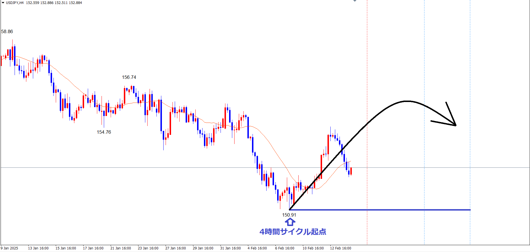 4時間サイクルは、起点青のライン(2/10の安値150.91)から、現在28本目の形で見ていきます✅