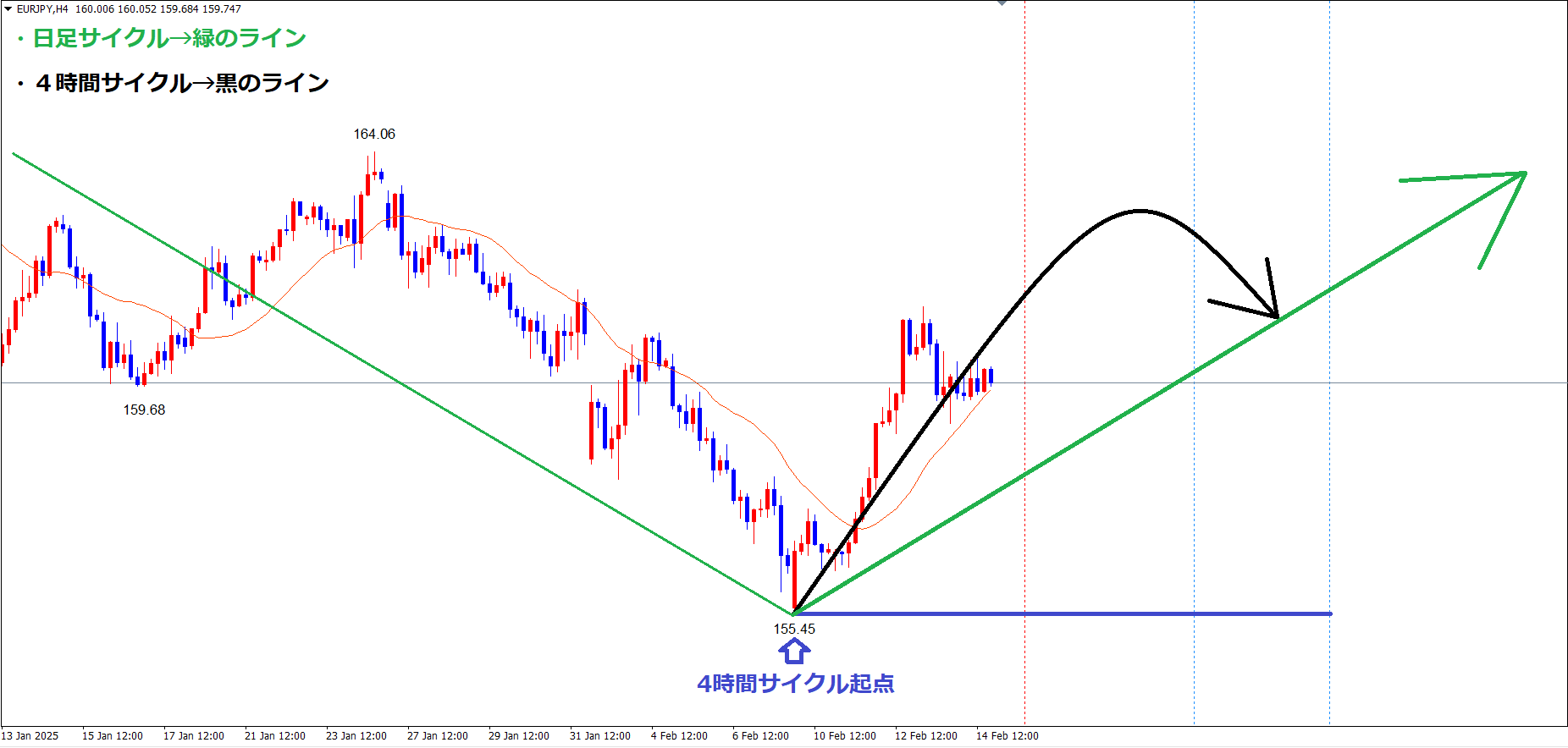 4時間サイクルは、起点青のライン(2/10の安値155.45)から、現在30本目です✅
