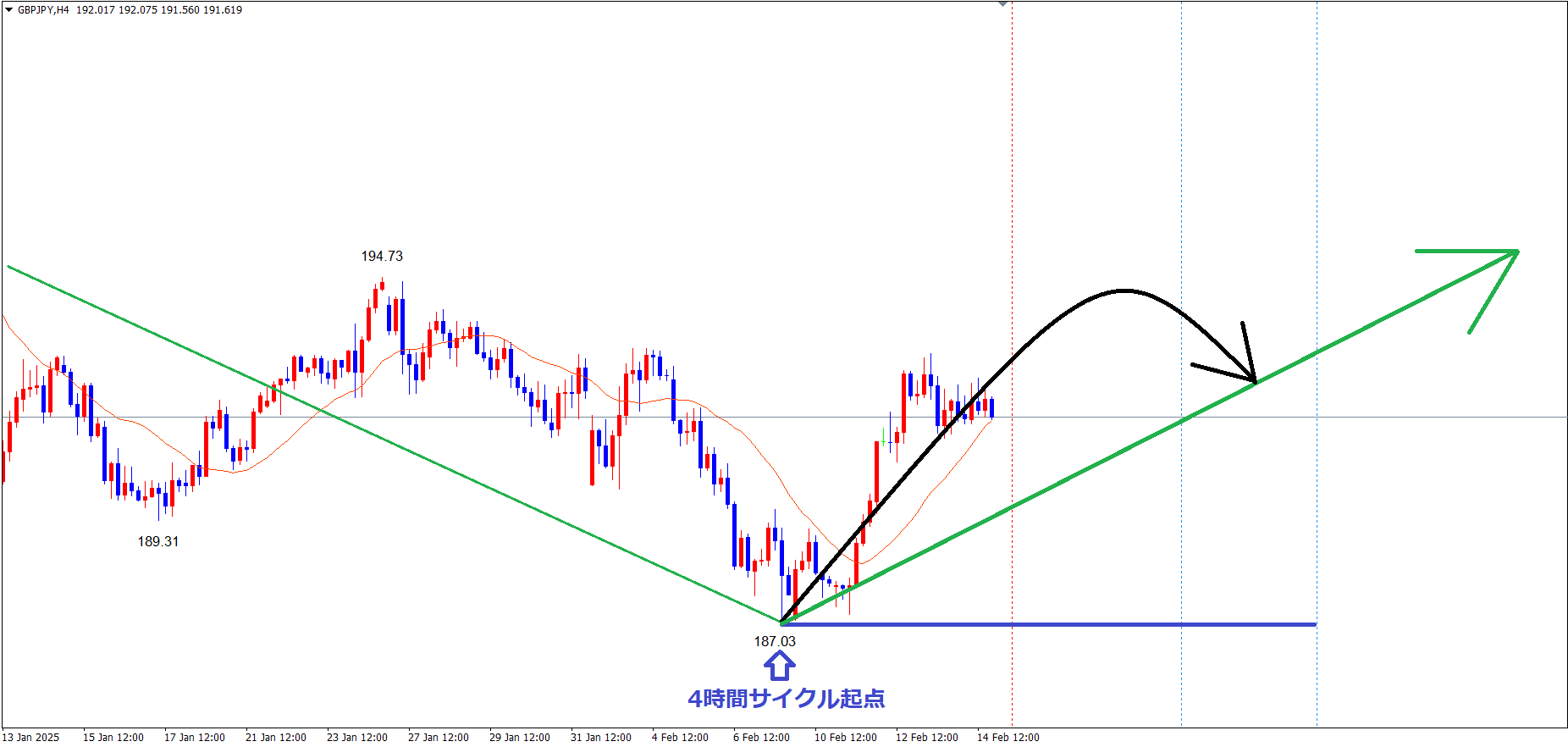 4時間サイクルは、起点青のライン(1/17の安値189.31)から、現在32本目です✅