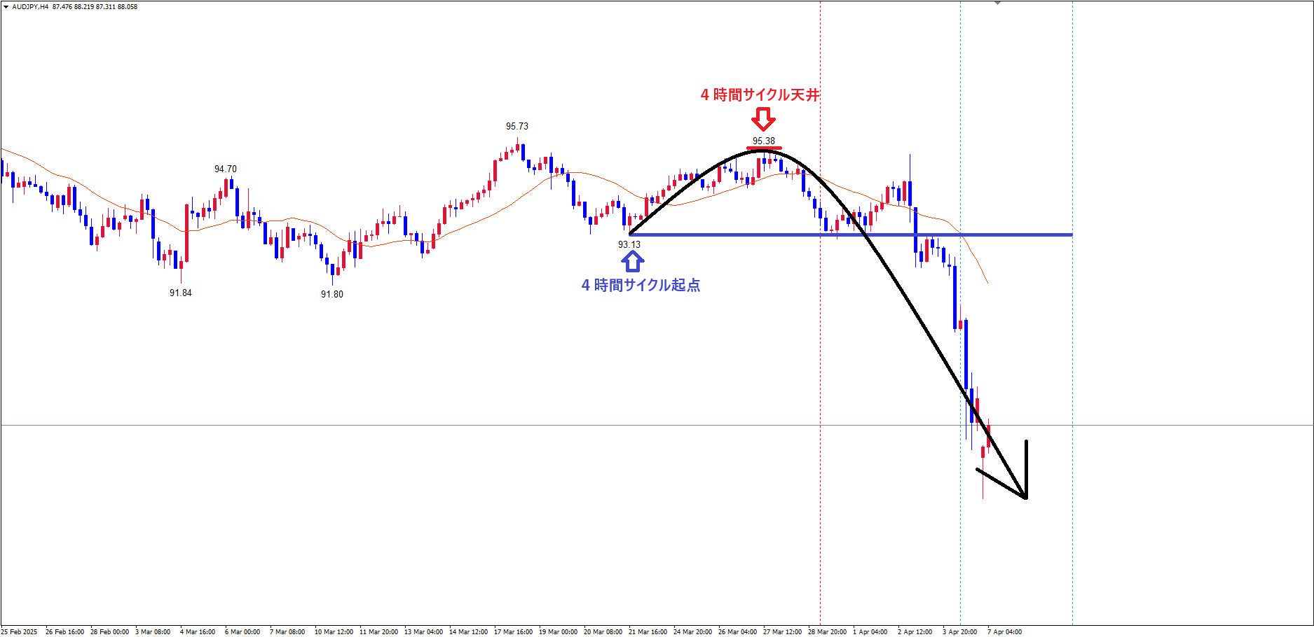 今回の4時間サイクルは、起点青のライン(3/21の安値93.13)を割れている事で、