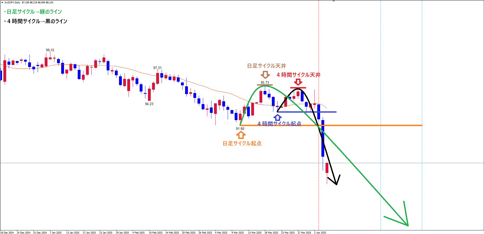 現在は、赤のライン(3/27の高値95.38)で天井を付け、サイクル底へ向けて下落の波、方向感:下方向 という認識です✅