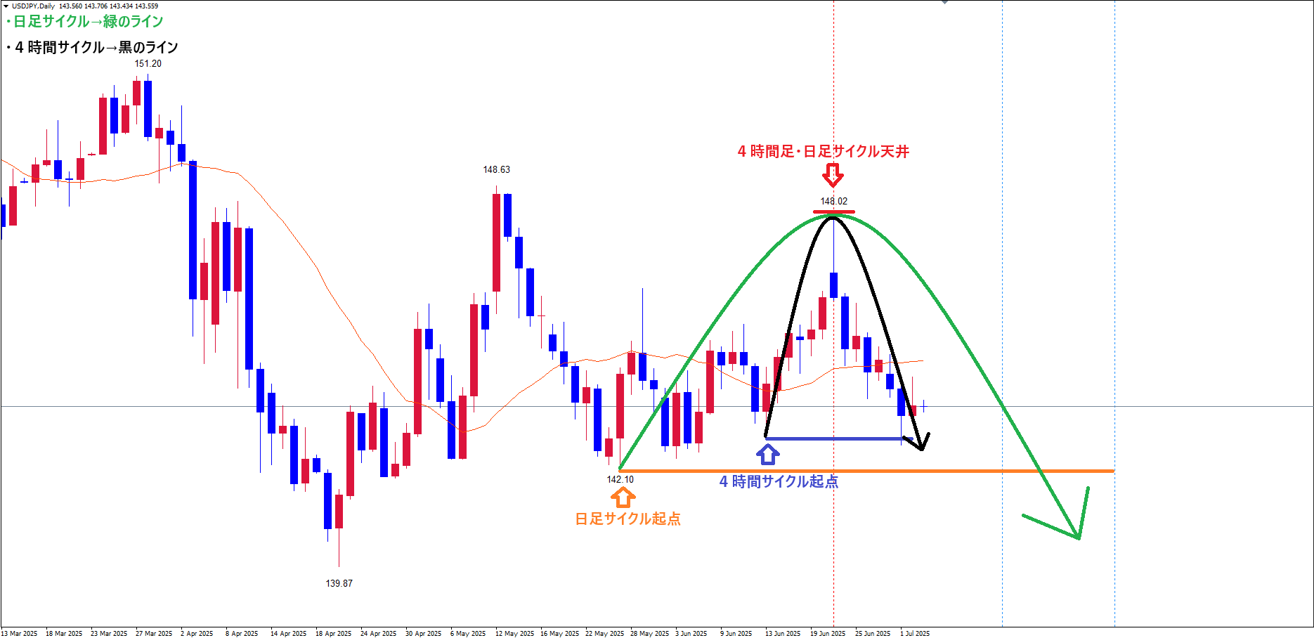 今後は、日足サイクル起点オレンジのライン(5/27の安値142.10)以下まで、底へ向けて下落の波が継続していくイメージです✅