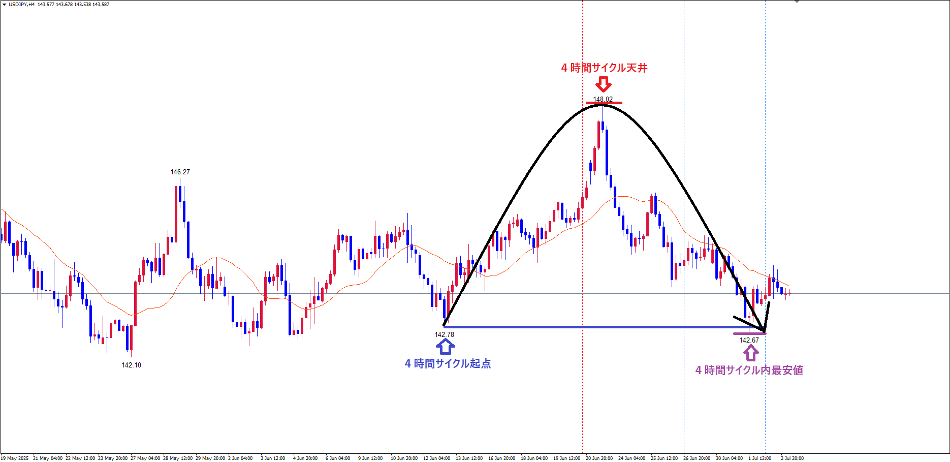※サイクル理論的には、本来青のライン(6/13の安値142.78)を起点に見る事は出来ませんが、