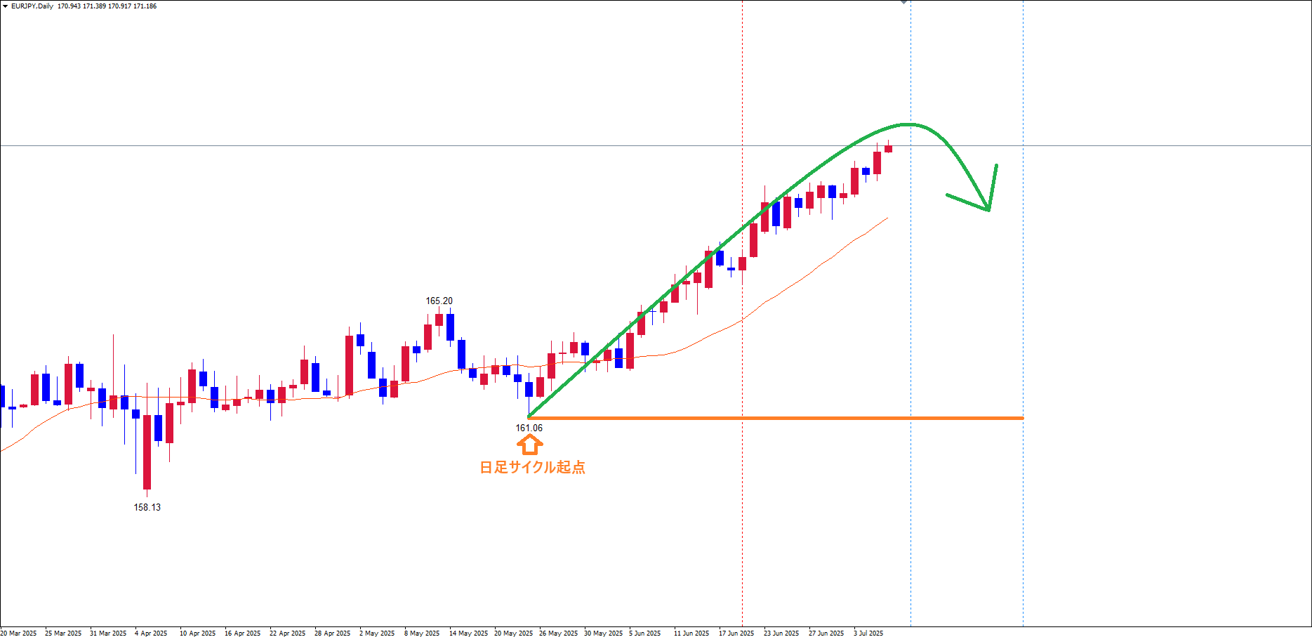 日足サイクルは、起点オレンジのライン(5/23の安値161.06)から、現在33本目の形です✅