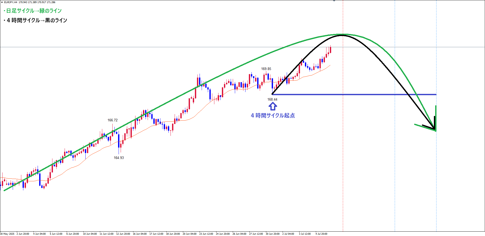 先程解説した様に、日足サイクルは天井を付け、下落の波に切り替わるタイミングで、