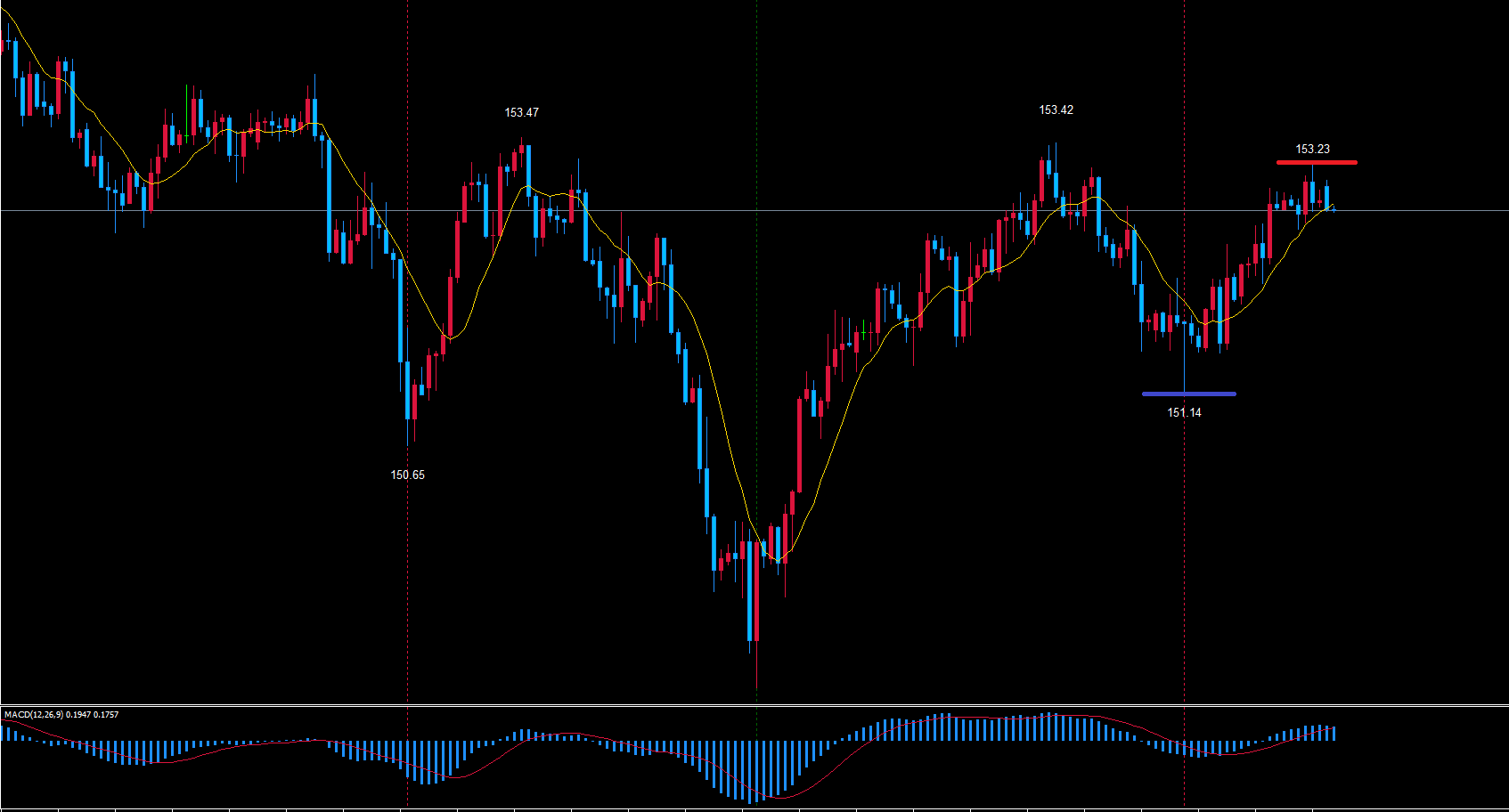 ただ、現在は22本目と、中央まで13本程度の余裕があるので高値の赤のライン153.23を超えて天井を付けてから下落に入る事も考えておきます。