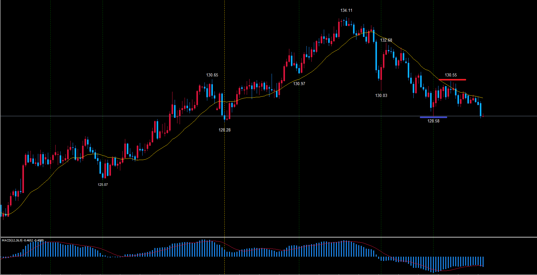 既に天井が確定しているので、仮に上昇しても赤のライン130.55を超える事無く戻しを付けて、再度底へ向けて続落の展開で考えていきます。