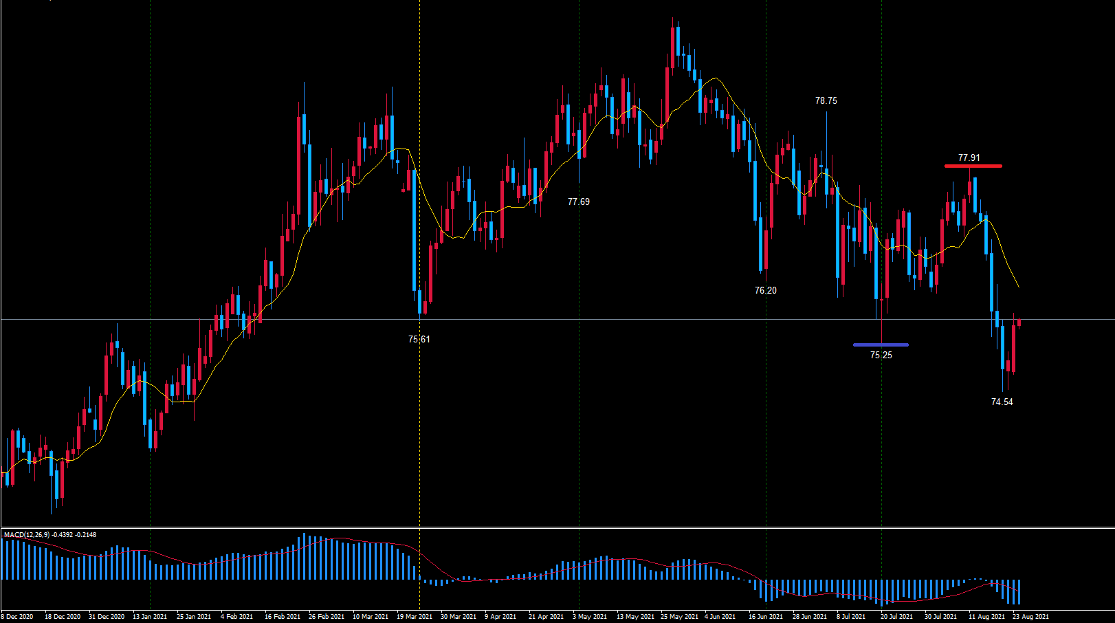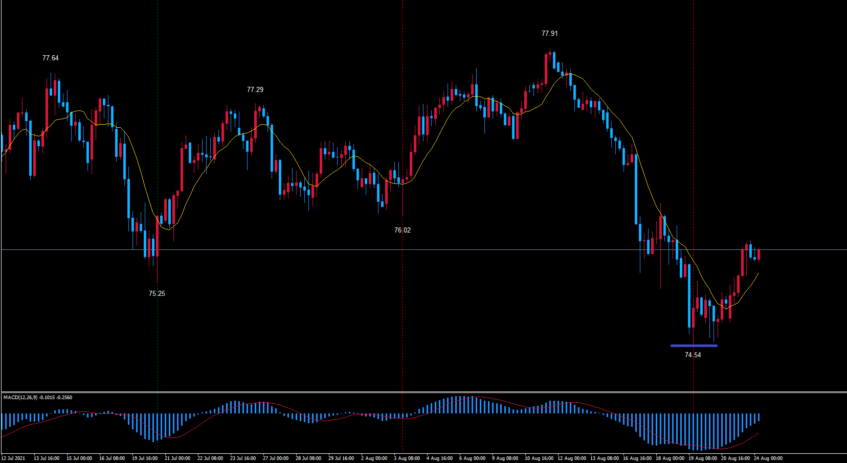 なので、現在は17本目の高値の赤のライン77.91で天井を付けて、底へ向けて下落中です。