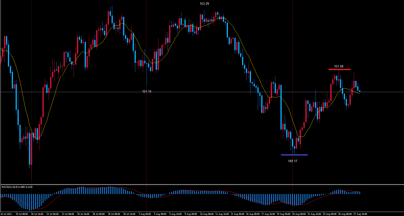 赤のライン151.58付近までの戻し、これから高値を更新して天井を付ける展開になればショート狙っていきます。