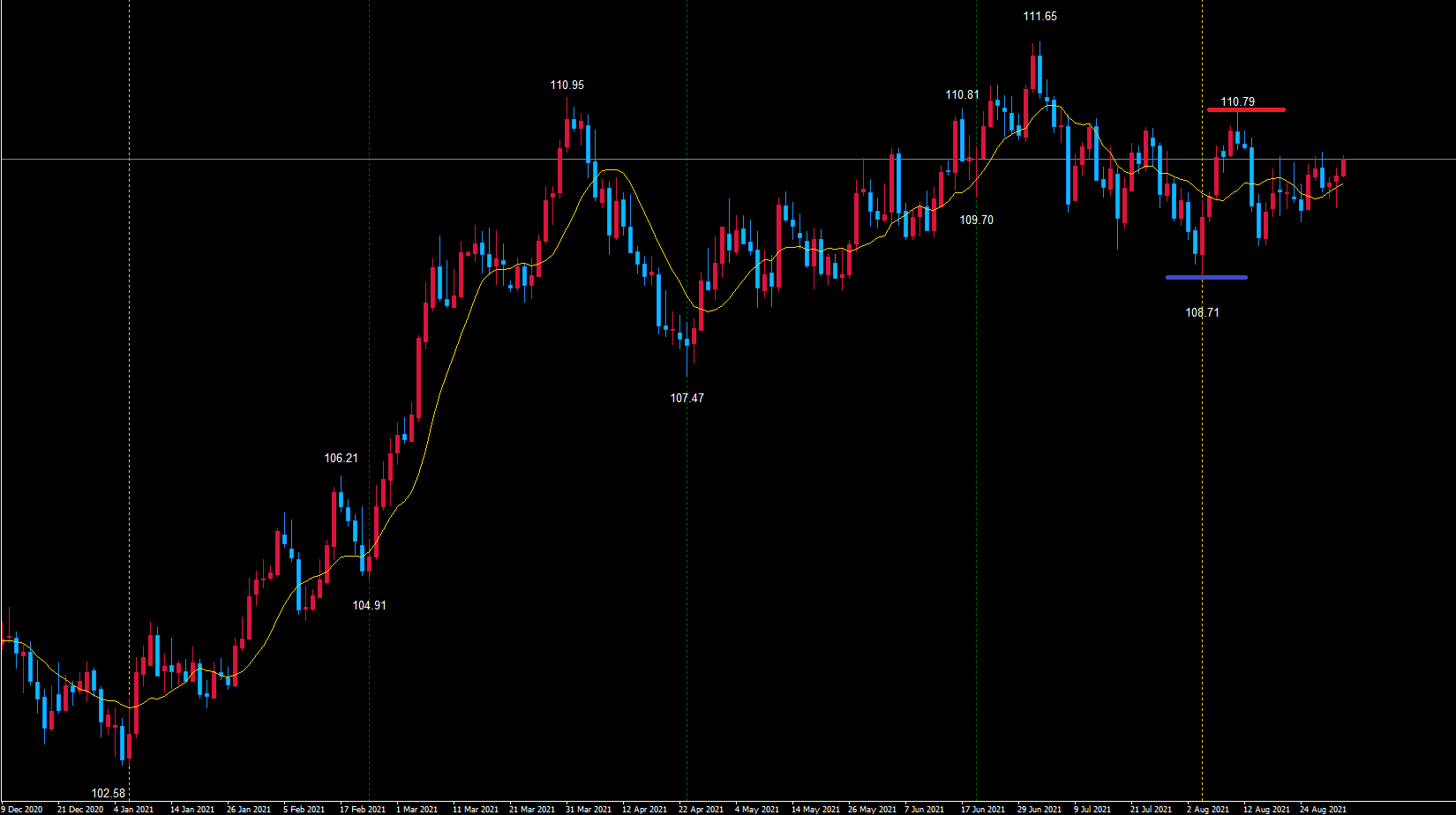 ・起点の青のライン109.10以上、天井の赤のライン110.26以下で底を探っていきます。