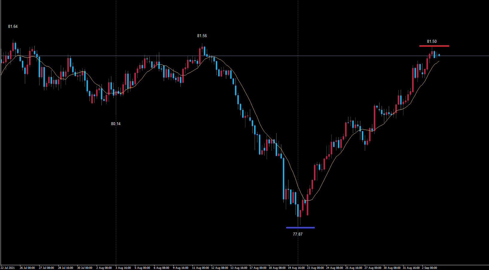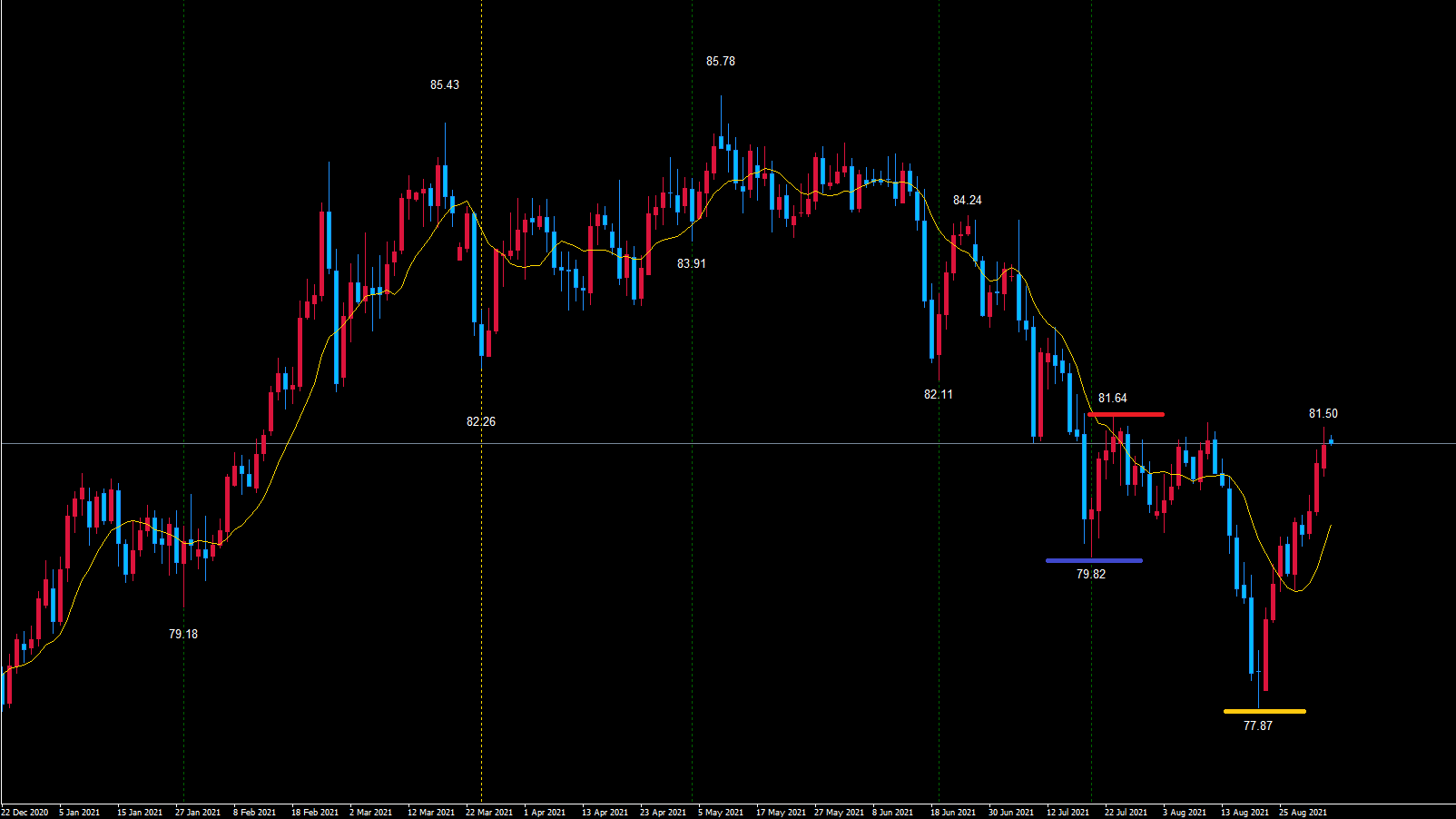 このまま赤のライン81.64を超えていけば、黄色のライン77.87で底を付けている事が確定します。