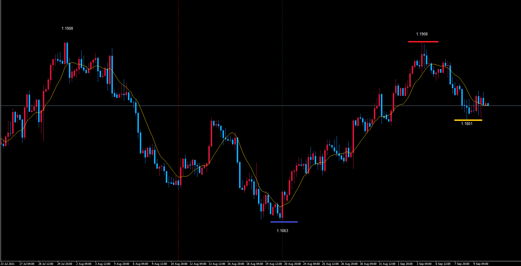 黄色のライン1.1801からの4時間サイクルの想定は少し判断しづらい状況です。