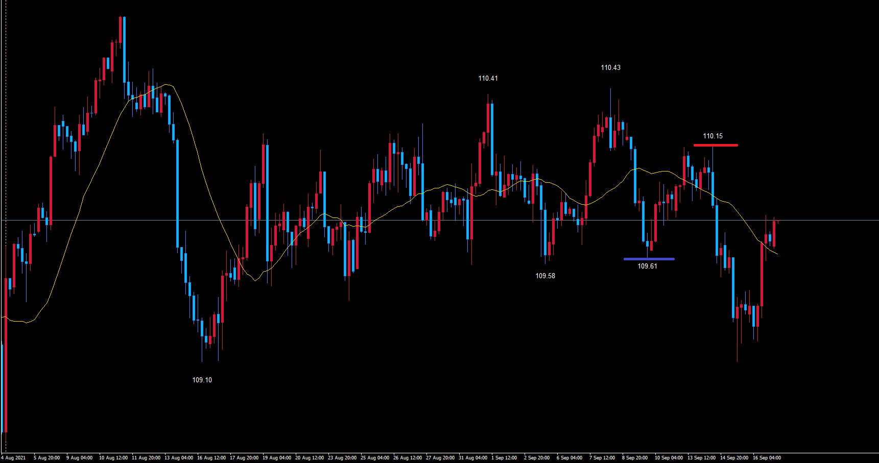 既に戻しとなる4時間サイクルの天井を赤のライン110.15で付けているので、