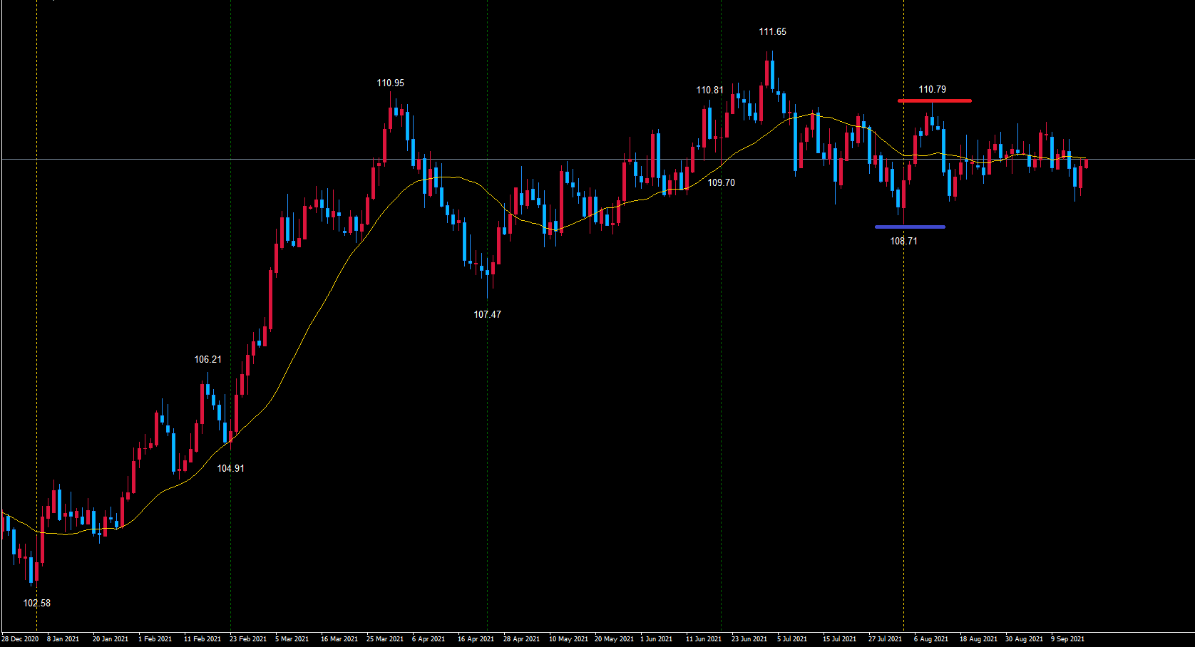 そして、週足サイクル内の現在の最安値は、日足サイクル起点の青のライン108.71です。
