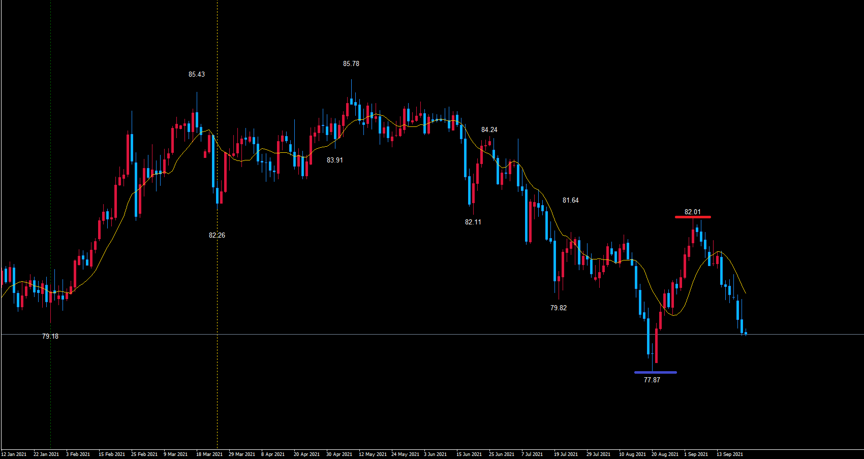 現在、週足サイクル内の最安値は日足の起点の青のライン77.87です。