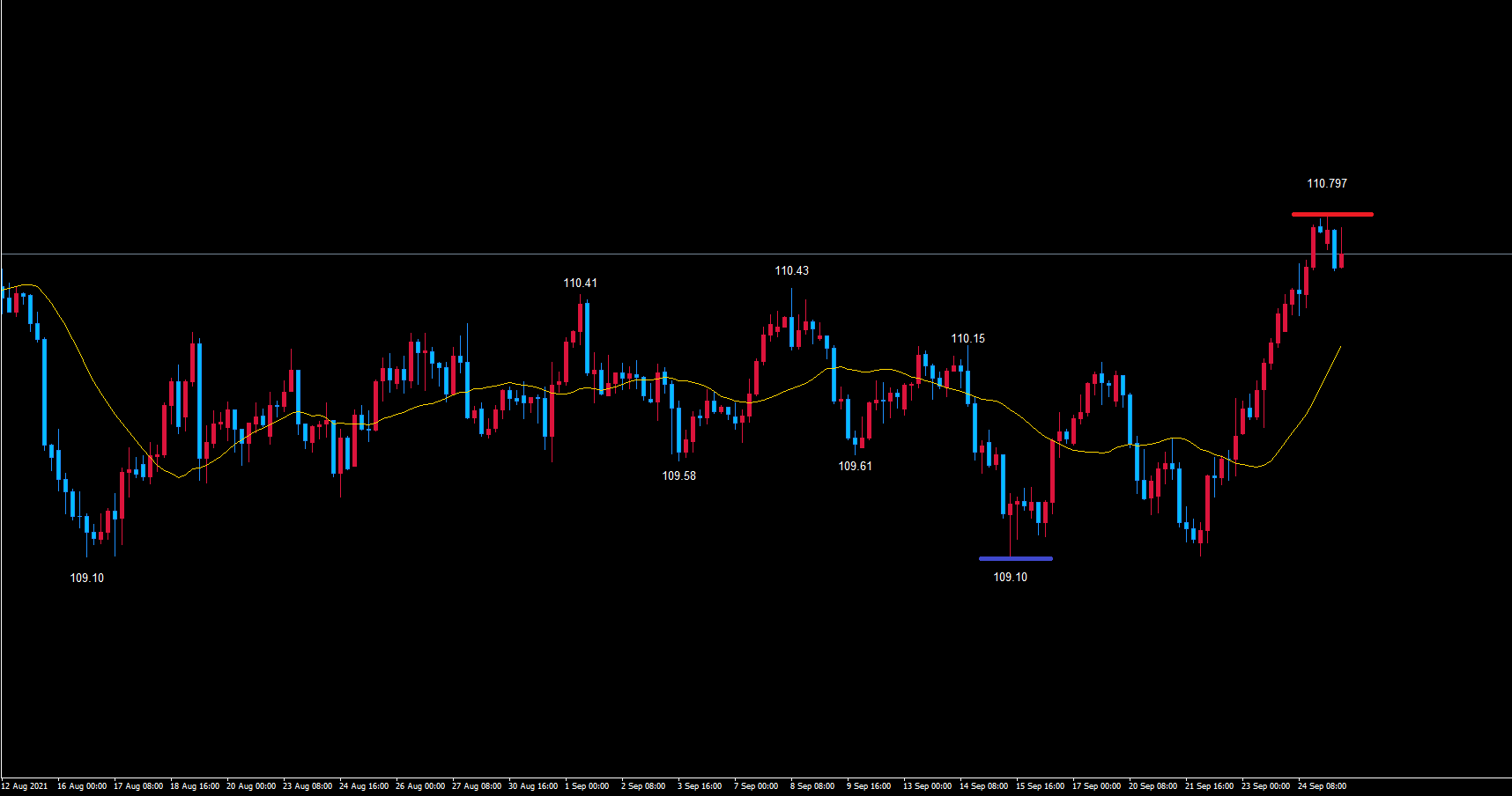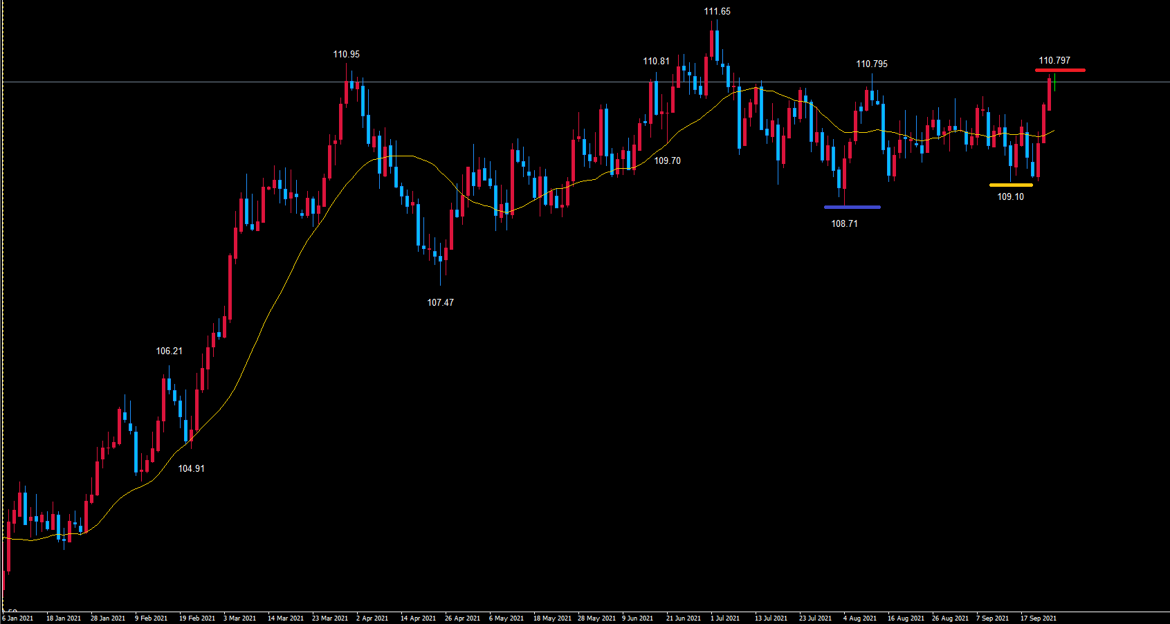 直近の高値の赤のライン110.79で既に天井を付けている可能性もありますが、
