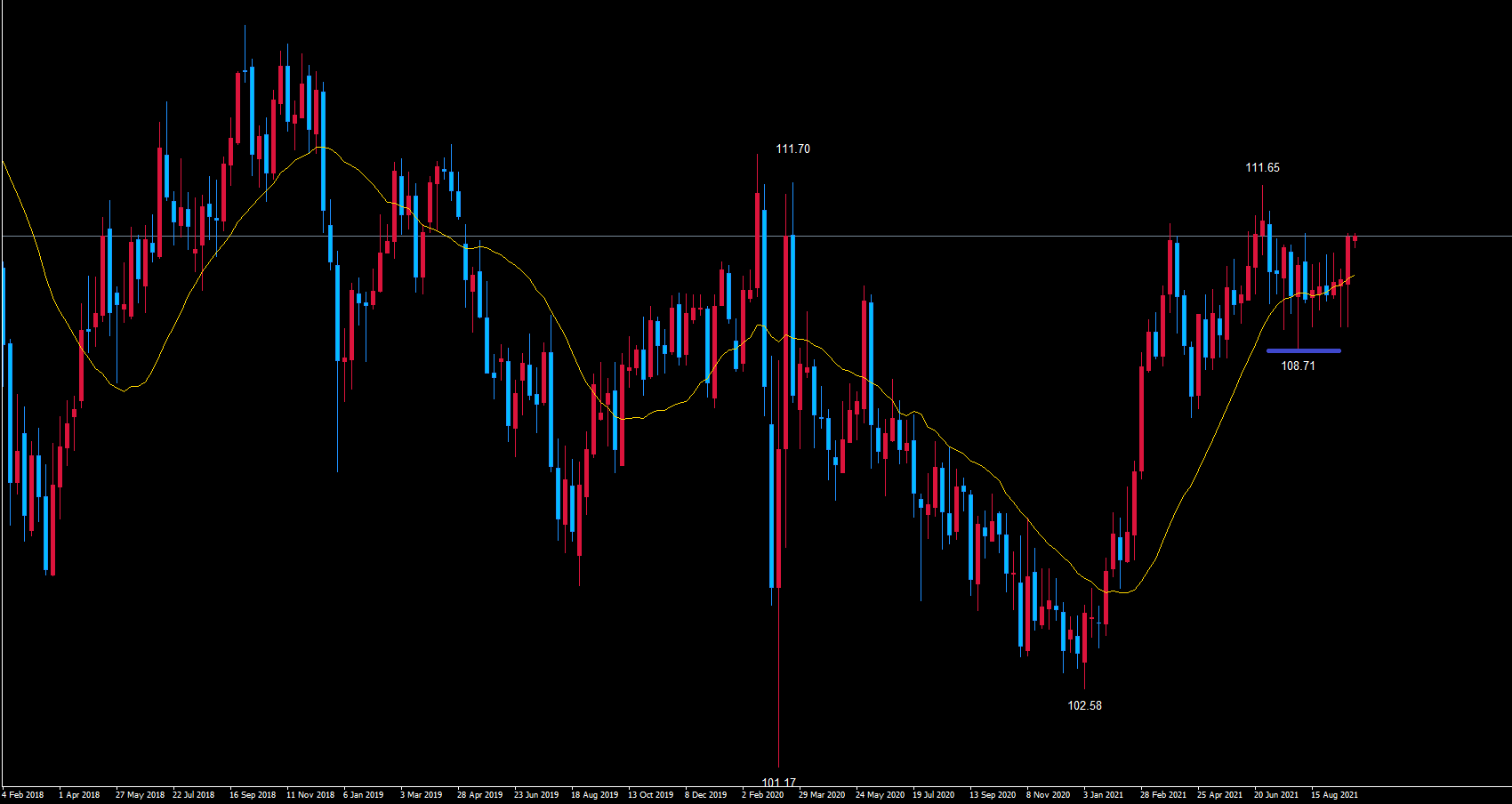 青のライン108.71で底を付けて次の週足サイクルに入っていると見ています。