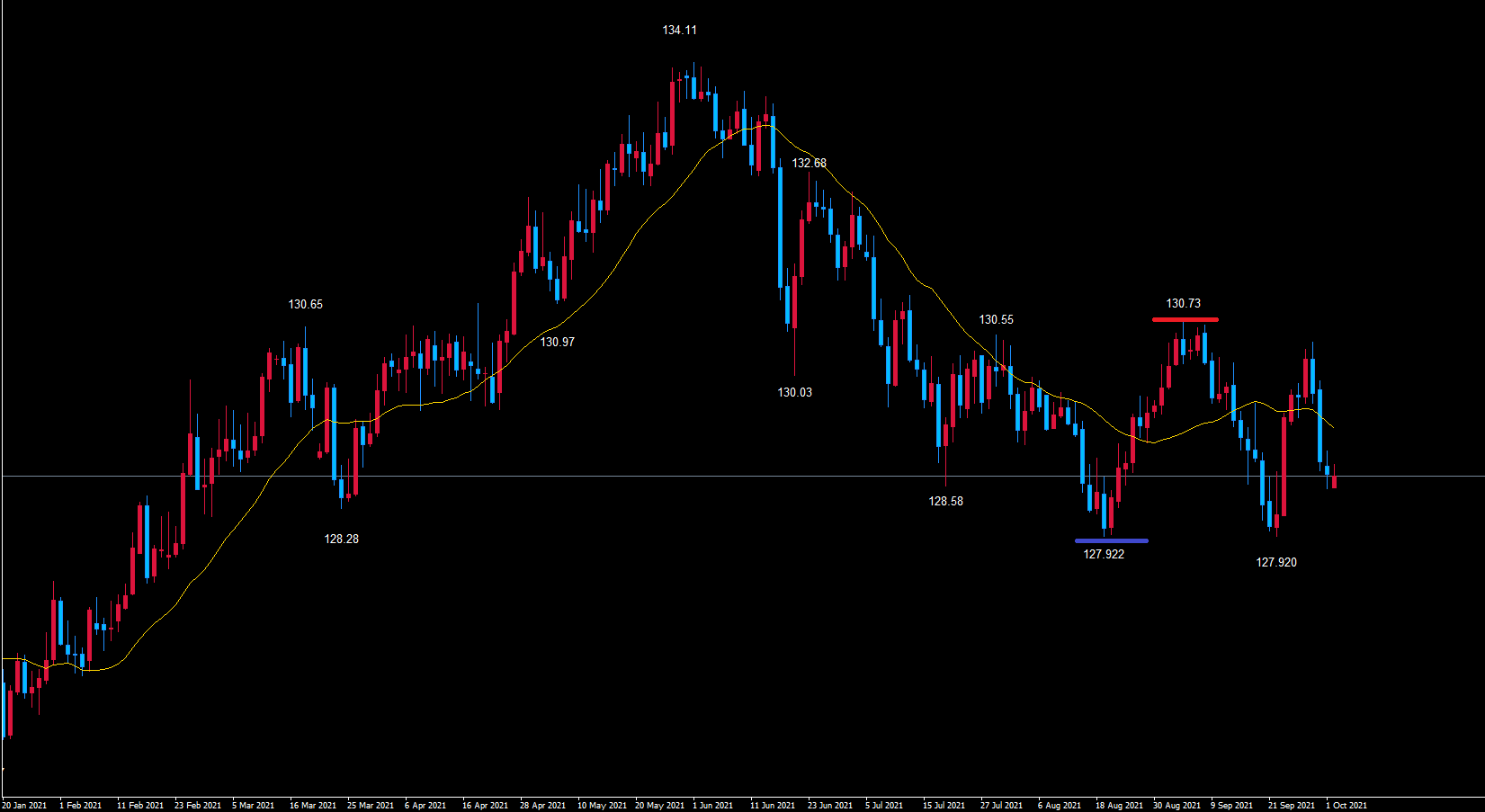 逆に127.920を割れるまでは、イレギュラーで日足サイクルも127.920で反転している可能性も頭の片隅には置いておいてください。
