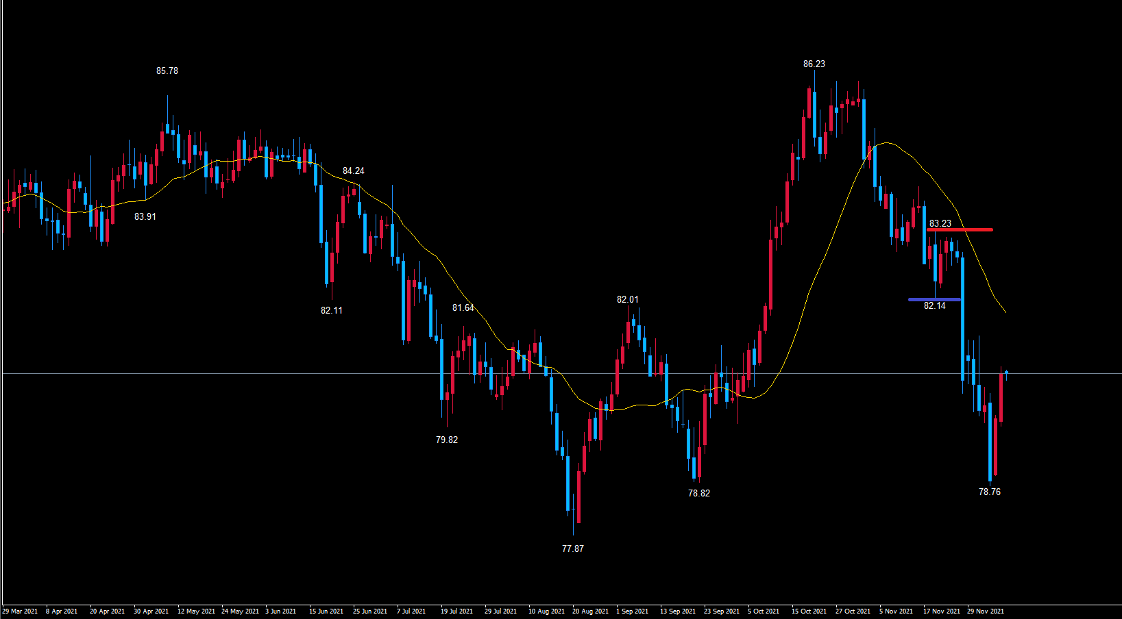 現在は天井の赤のライン83.23から底へ向けて下落中です。