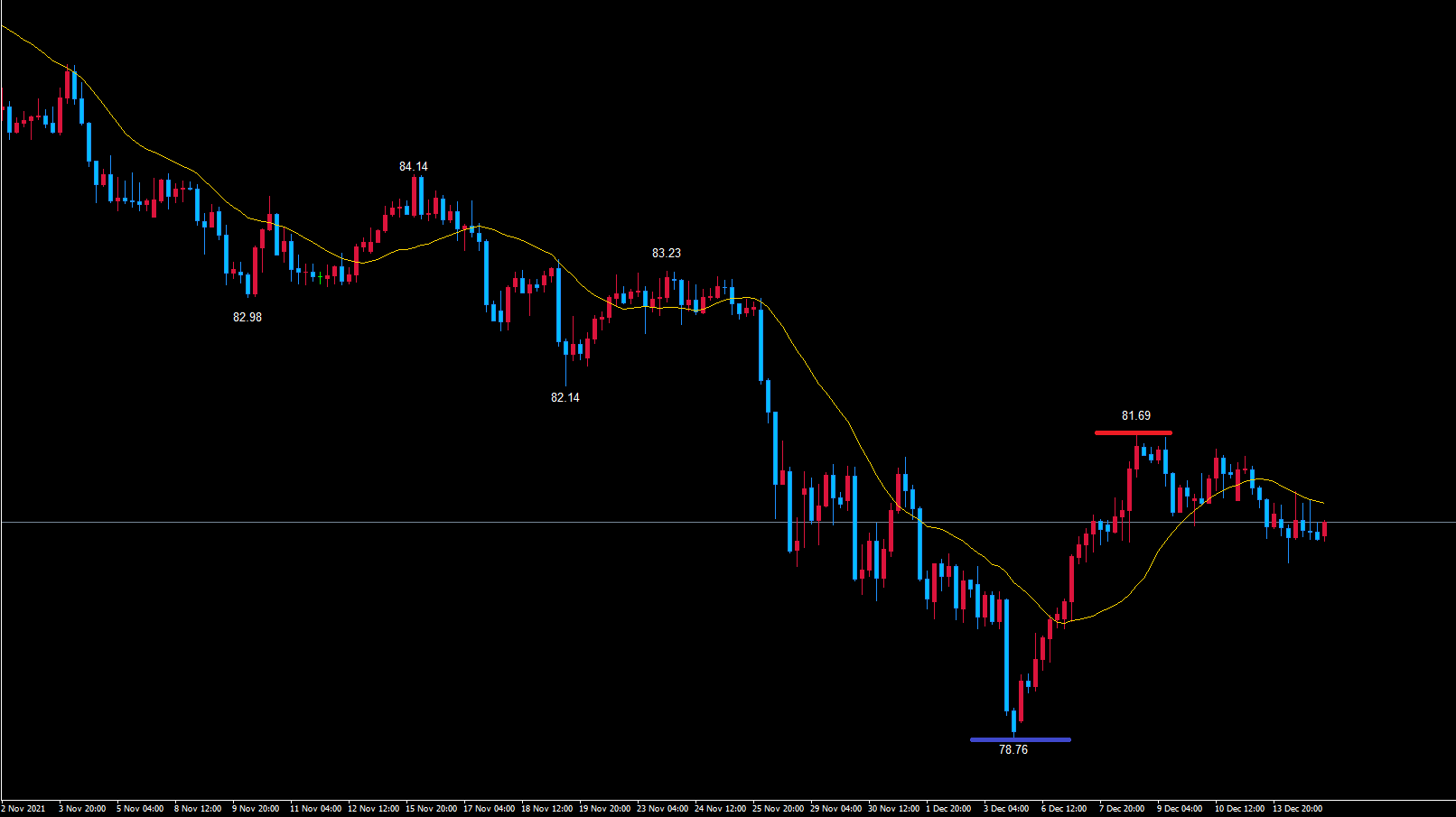 豪ドル円4時間サイクルは起点の青のライン78.76から現在46本目です。