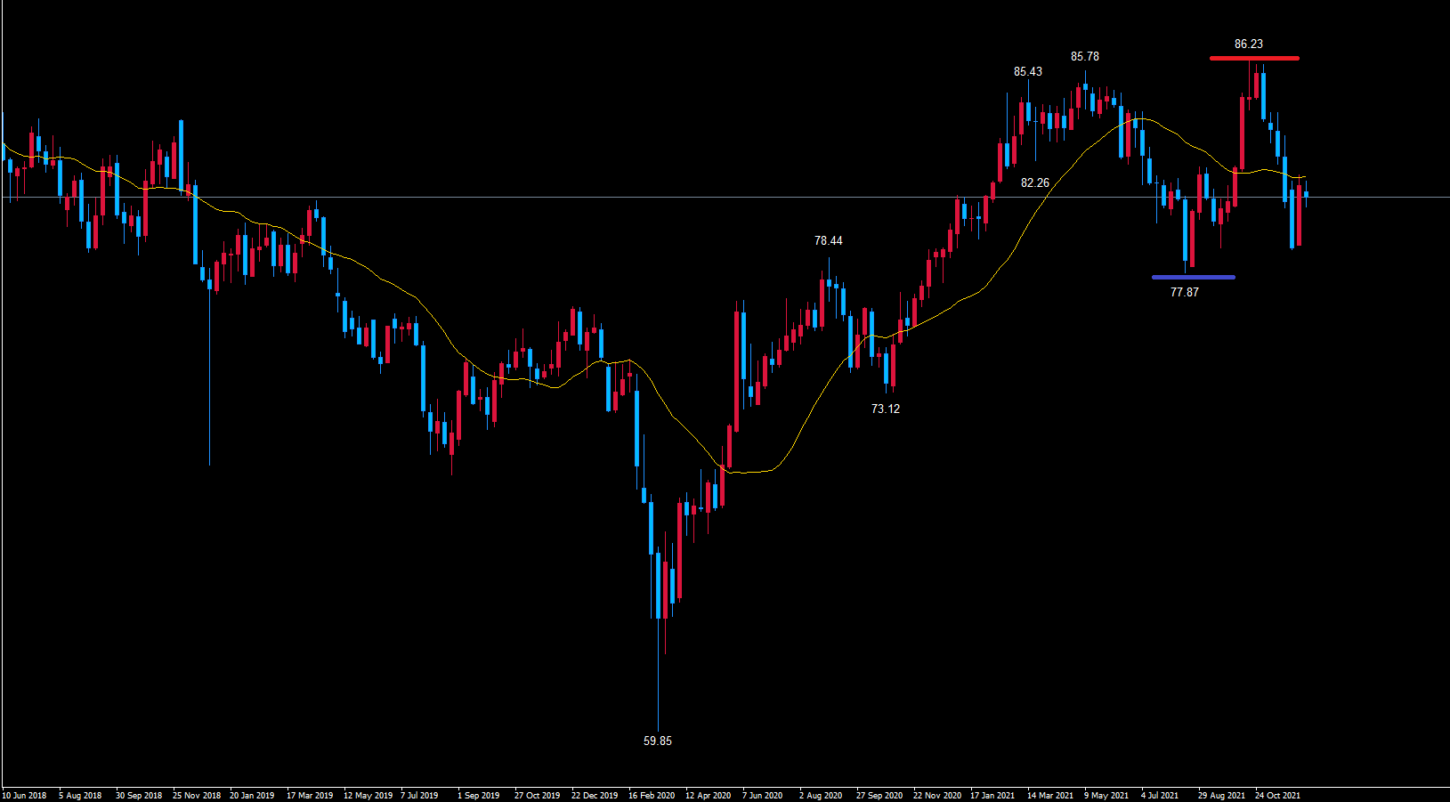 また、週足サイクルもレフトトランスレーション想定なので、今後起点の青のライン77.87割れなるかが注目のポイントになります。