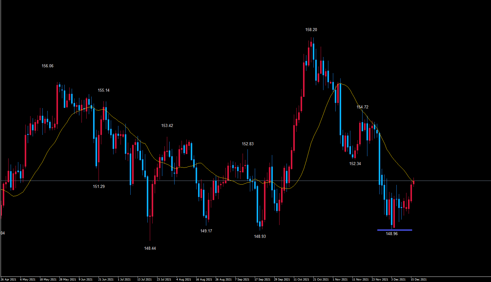 天井を付けて下落しても、起点の青のライン148.96以上で底を付けるので注意しておいてください。