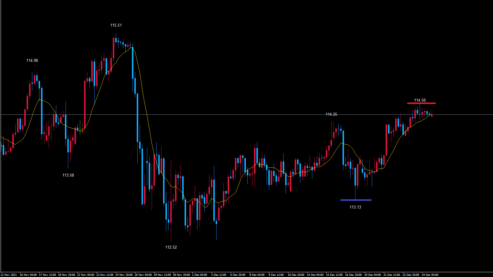 なので、赤のライン114.50で既に天井を付けている可能性を考えています。