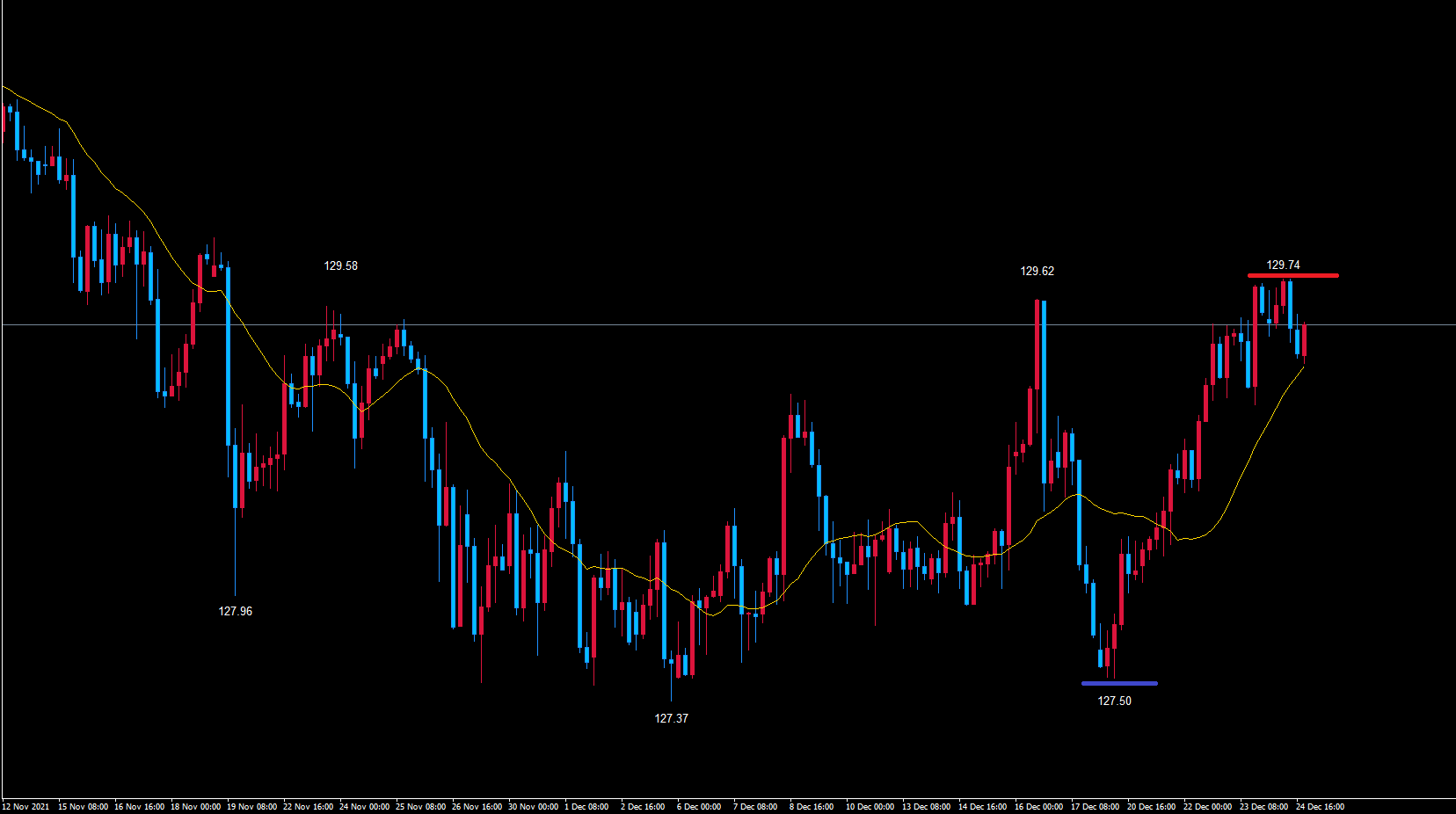 なので、赤のライン129.74で既に天井を付けている可能性を考えています。