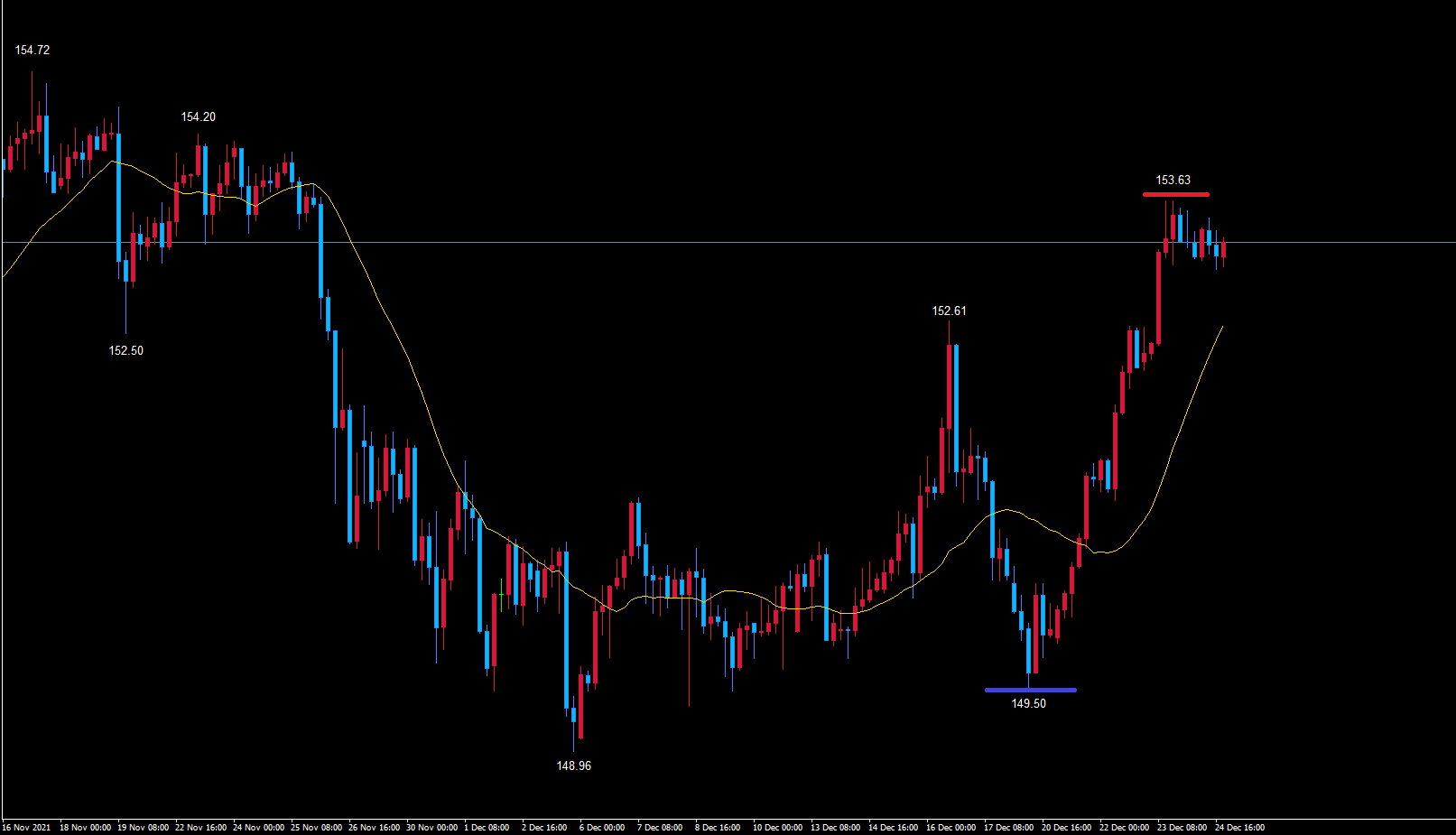 なので、赤のライン153.63で既に天井を付けている可能性を考えています。