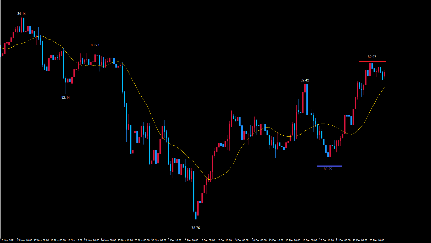 なので、赤のライン82.97で既に天井を付けている可能性を考えています。