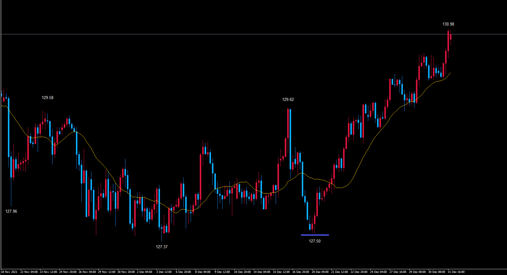 そして、天井を付けて下落しても、今回の4時間サイクルは起点の青のライン127.50以上で底を付ける可能性が高いのでポイントとして頭に入れておいてください。