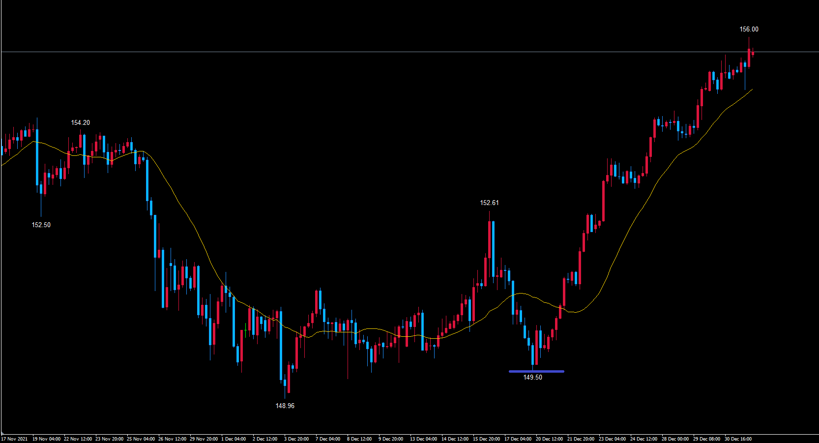 ポンド円4時間サイクルは、現在サイクル内の最高値156.00を56本目に付けているので、ライトトランスレーションのサイクルを形成する可能性が高いです。