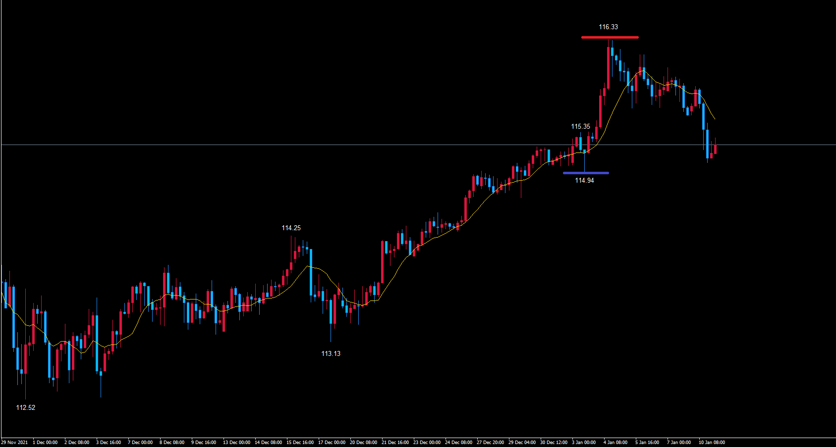 この中で、先ほどお伝えしたように、4時間サイクルでは赤のライン116.23で天井を付けている可能性が高いので、