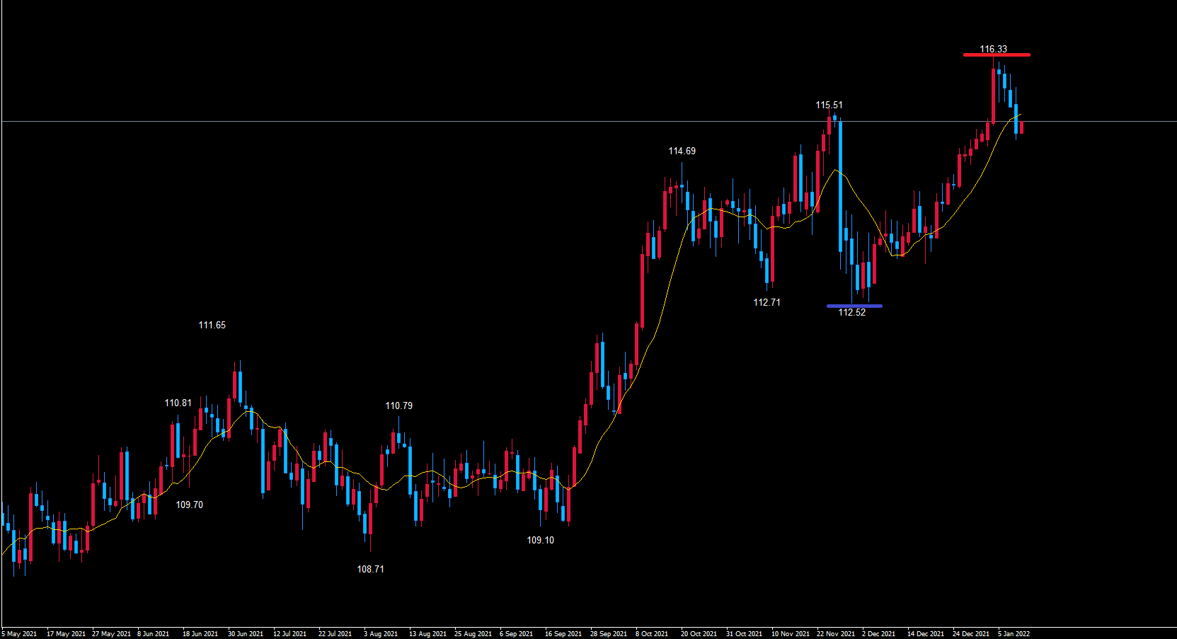 ただ、これから赤のライン116.33までの戻すという事も考えづらいので様子見が無難です。