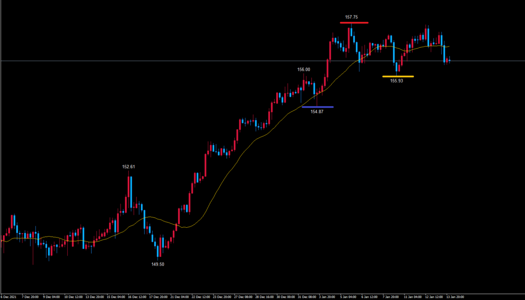 ただ、クロス円は現在10日の安値から上昇が強い状況となってきていて、赤のライン157.75付近までの戻しがありました。