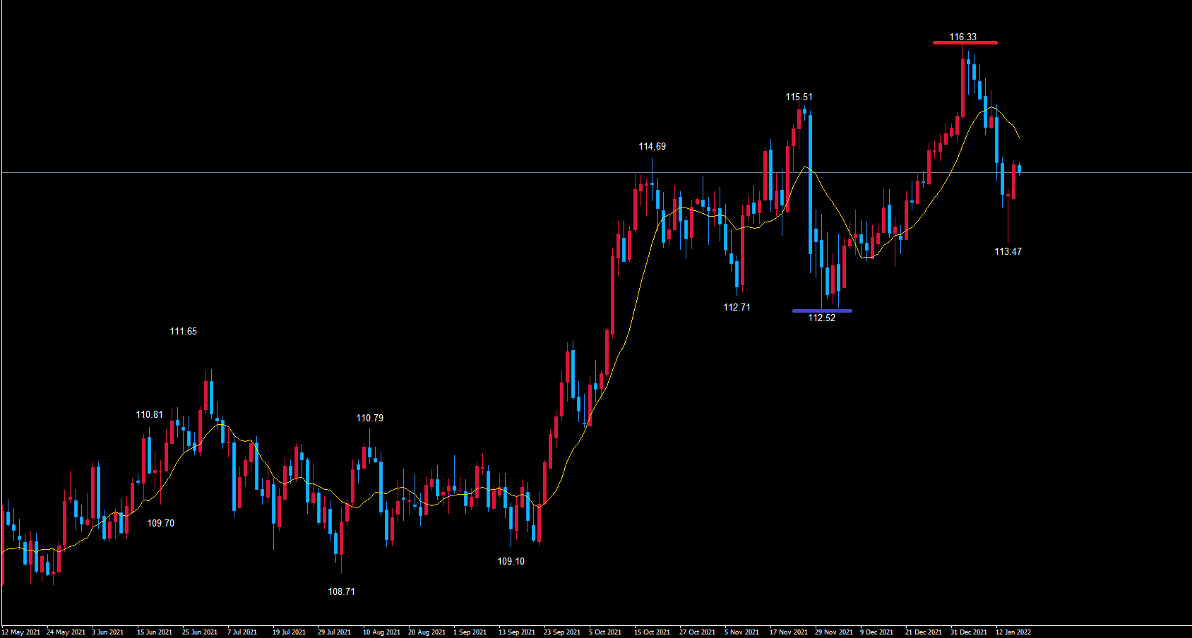 今後黄色のライン113.47を割れずに上昇していく場合、黄色のライン113.47が起点と見ていく必要が出てくるので、今の内から頭に入れておいてください。